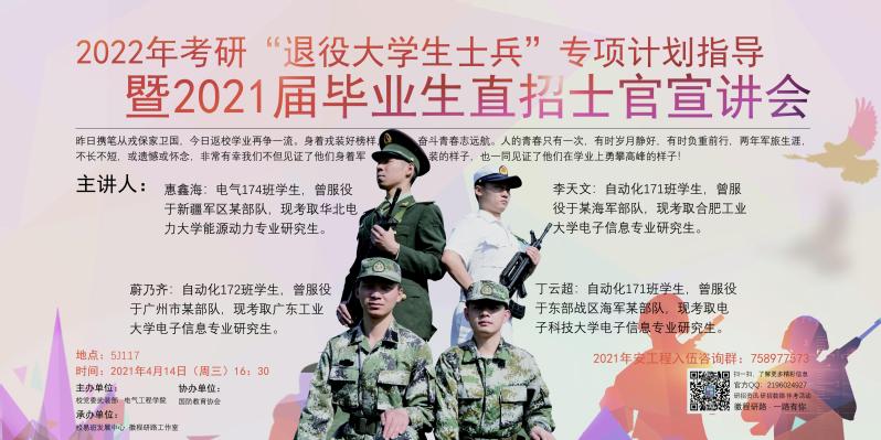 为积极贯彻上级有关文件和会议精神,落实高校征兵宣传“六个一”要求,激发大学生参军入伍、携笔从戎的热情,武装部联合电气工程学院共同举办2022年考研士兵专项计划指导暨2021届毕业生直招士官宣讲会,相关内容通知如下: