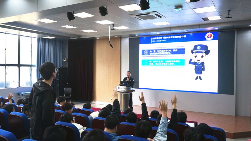施飞飞首先介绍了2022年鸠江区电信网络诈骗案件数量及涉案金额,对当前电信网络诈骗案件特点、案发过程进行分类分析,紧密结合电信网络诈骗在学生群体中多发、高发的形势和典型案例,通过以案说法深入浅出地讲解了电信诈骗的危害性。针对当前案发率排名前三的案件类型即“杀猪盘”、裸聊敲诈、刷单诈骗进行逐一分析讲解,分享自己在接报警、案情分析研判、案件侦破、抓捕和审讯嫌疑人过程中的心得体会,提醒在座师生不要向陌生人汇款、转账,不要将手机卡、银行卡外借,不贪图小便宜,收到疑似电信网络诈骗的电话、信息,及时向辅导员、学校保卫处寻求帮助或者拨打110报警电话。