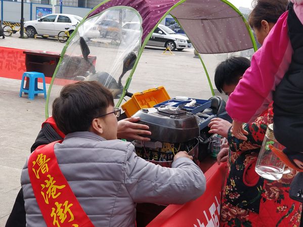 “满天星”家电义务维修和“蒲公英”科普进社区团队携带维修家电的基础工具、器件以及科普宣传手册,在到达指定地点后,第一时间搭建起了维修服务站,居民们也陆续将故障家电送来维修。