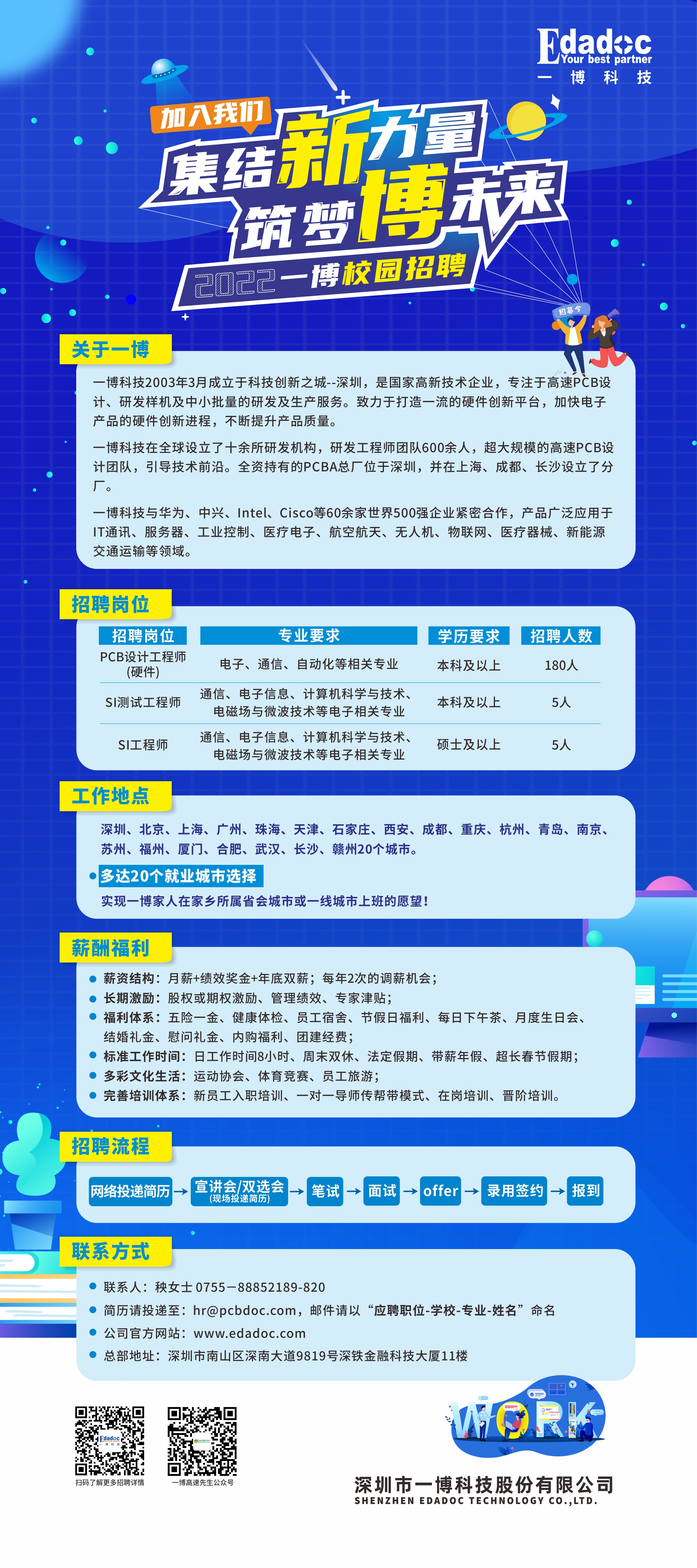 深圳市一博科技股份有限公司(简称“一博科技”)成立于2003年3月,国家高新技术企业。一博科技专注于高速PCB设计技术服务、研发样机及中小批量的研发及生产服务,致力于打造一流的硬件创新平台,加快电子产品的硬件创新进程,提升产品质量。一博科技是华为、中兴、Intel、Cisco等60余家世界500强的认证合作伙伴,涉及IT通讯、服务器、工业控制、医疗电子、航空航天、无人机、物联网、医疗器械、新能源汽车、轨道交通等领域。