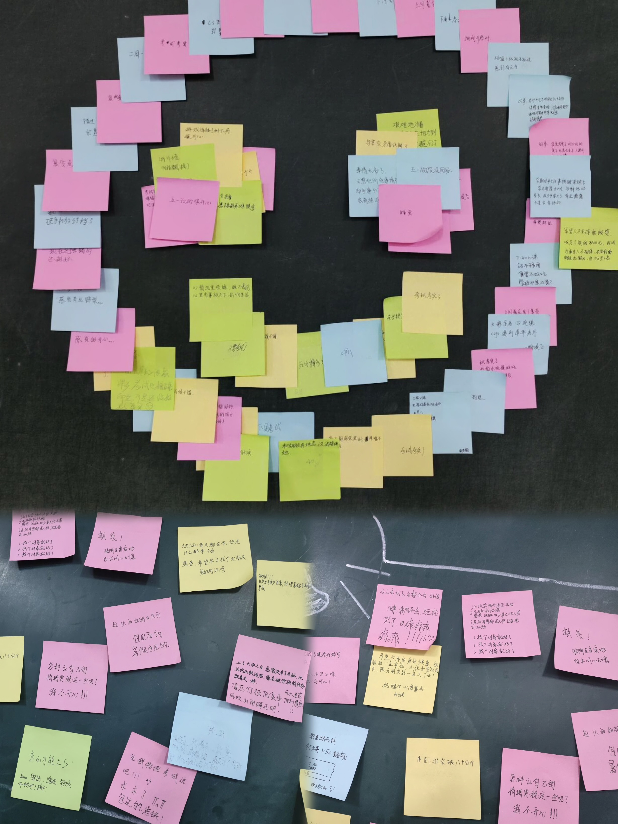 活动共分为两个阶段,第一阶段为敞开心扉,同学们可以选择黄色或粉色卡片写下开心幸福的事情,传播快乐感染他人。也可以选择蓝色或绿色卡片写下最近烦恼和难过的事情,一吐心中块垒。活动中,各班心理委员组织有序,宣传到位,同学们热情高涨。