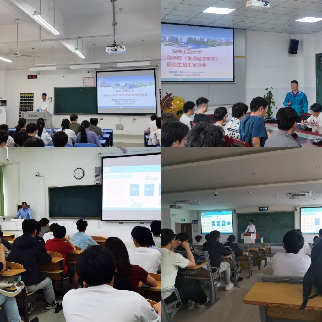 为进一步拓宽生源渠道、提高生源质量,电气工程学院(集成电路学院)于五月至六月初开展了2025年研究生招生系列宣讲活动。学院研究生导师林信南、代广珍、柏受军、瞿成明、魏利胜、葛强分别赴淮南师范学院、安徽信息工程学院、安徽科技学院、池州学院、铜陵学院、巢湖学院和皖西学院等高校进行招生宣传。本次宣讲活动内容紧扣考生关切,参与宣讲的研究生导师系统、全面地介绍了学院学科建设的突出成果、招生计划、人才培养特色和研究生就业情况等。在答疑交流环节,现场学生踊跃提问发言,宣讲导师就相关问题进行了耐心细致地解答,现场交流气氛热烈,取得了较好的反响。