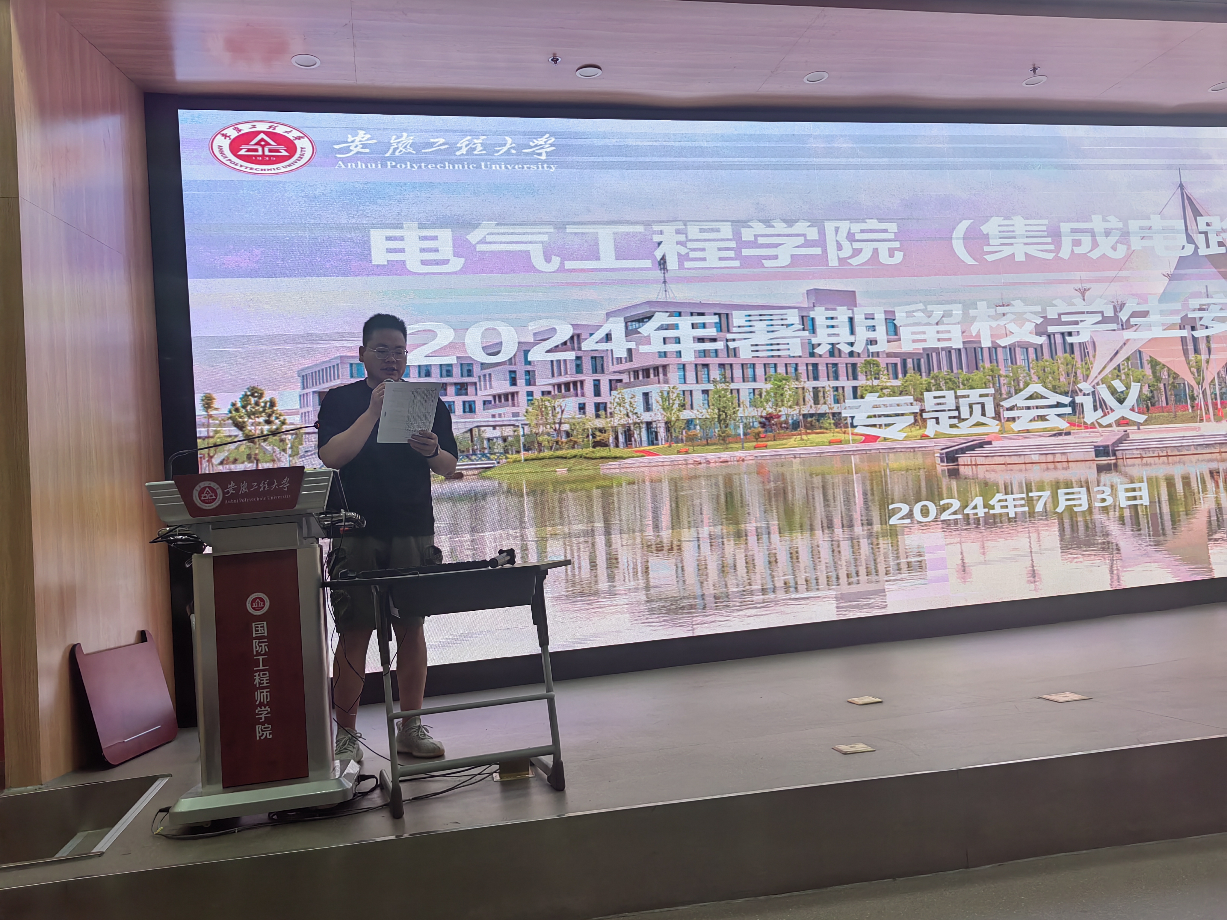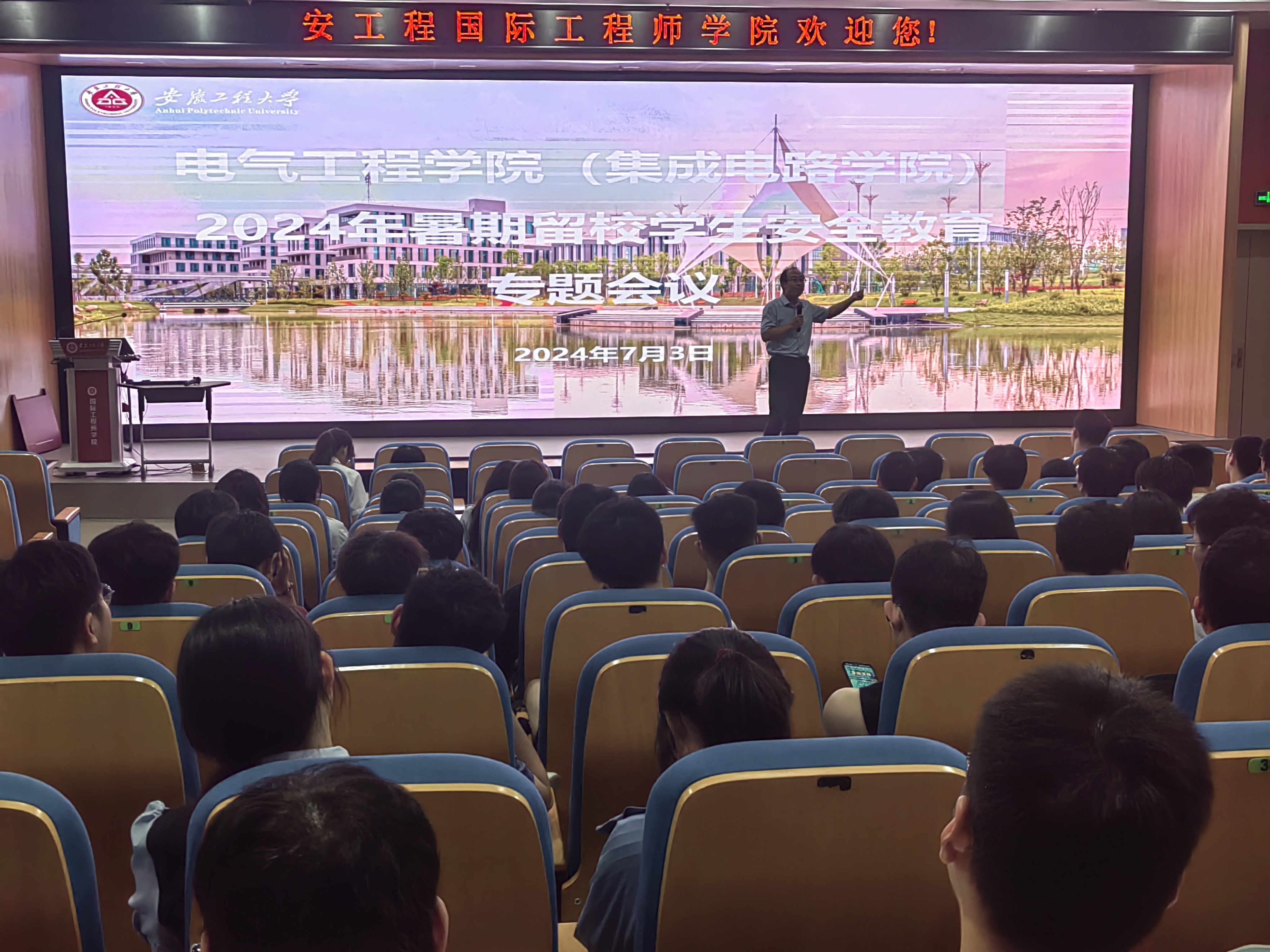 为进一步落实学校《关于加强暑期留校学生教育管理的通知》精神,7月3日下午,电气工程学院(集成电路学院)在国际工程师学院大报告厅召开暑期留校学生安全教育专题会议,以增强留校学生安全防范意识,维护假期校园安全稳定。学院党委副书记迟传德、全体辅导员及800多名留校学生参加了此次会议,会议由迟传德主持。