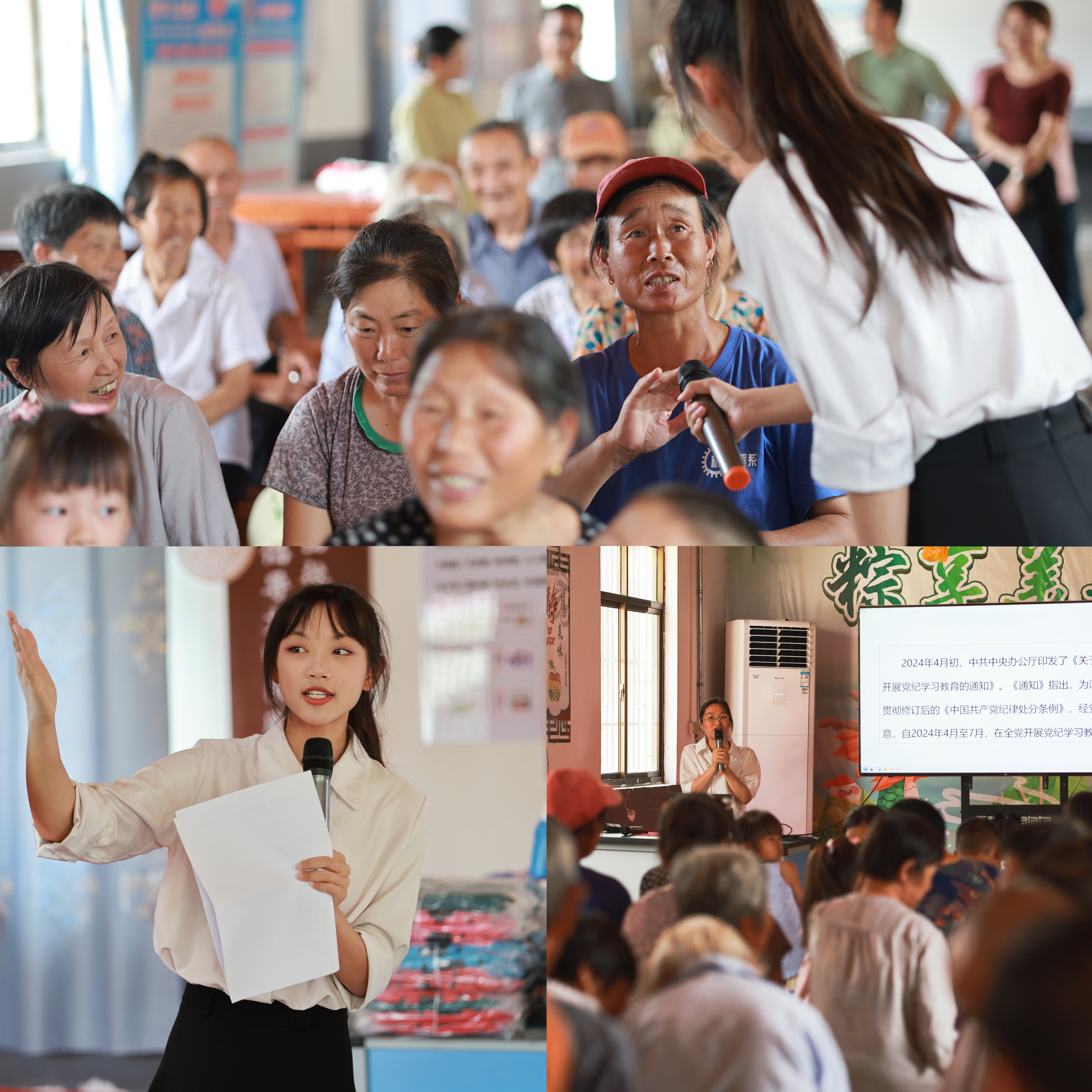 抵达后,欧亚琴老师为村民们带来了一场生动而深刻的《中国共产党纪律处分条例》解读讲座。她以贴近民生的视角,结合生动案例,让村民们深刻认识到条例的严肃性和重要性。学院青年讲师团成员胡雅琴同学分享了《益启爱》项目,并穿插“猜红歌”、党史知识竞赛等互动环节,村民们积极参与其中,与志愿者共同回顾党的光辉历程,坚定了大家跟党走、听党话的信念。