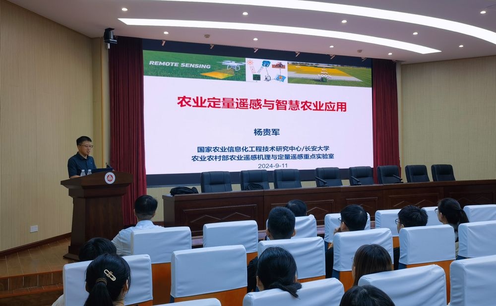 杨贵军教授主要从事农业定量遥感机理及应用研究。本次报告题为“农业定量遥感与智慧农业应用”。他在报告中深入浅出地介绍了农业定量遥感与无人机作物表型遥感的最新进展,并通过详实的数据和生动的案例,展现了这些技术在提高农业生产效率、促进农业可持续发展方面的巨大潜力。报告结束后,杨教授与研究生们进行互动交流,耐心解答了同学们提出的各种问题,并分享了自己在科研过程中的心得体会。这种开放、包容的学术氛围,不仅激发了同学们对农业遥感技术的浓厚兴趣,也让他们对智慧农业的未来充满了期待。
