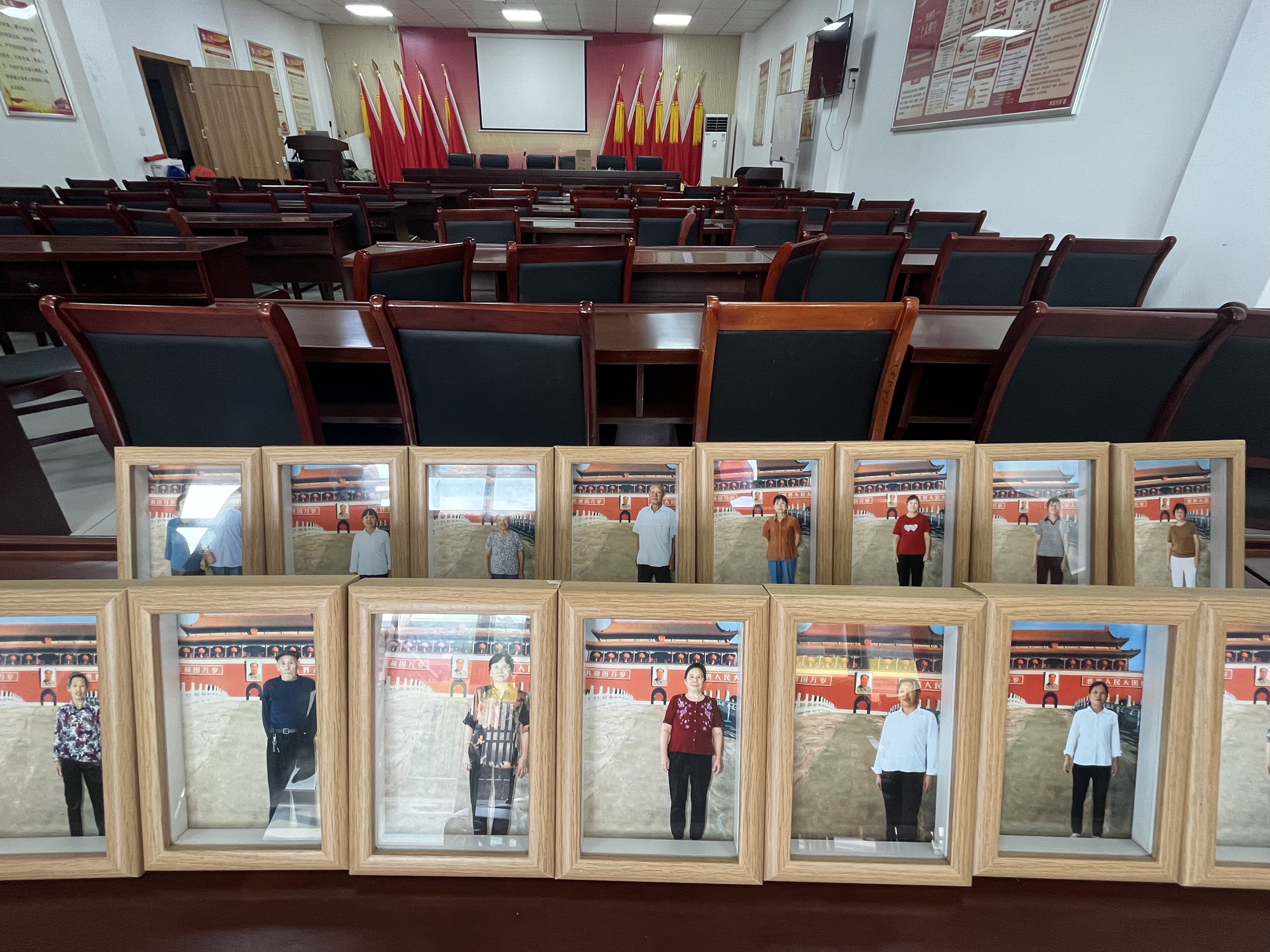 活动现场就非常热闹,志愿者组织老人们签到、整理衣冠、梳理发型,帮助行动不便的老人调整位置,为他们倒水,维持现场秩序,协助摄影师拍照。随着摄影师手中相机响起的快门声,老人们的笑脸被定格在照片中,经过精修、打印、覆膜等一番操作,照片装框送到各位老人的手里,老人们互相调侃,整个现场洋溢着快乐和喜悦。来参加活动的张奶奶激动地说道:“自己从来没有到过北京天安门,也没有自己的单独照片,非常感谢学院开展的这次活动,自己有了专属美照,圆了自己的梦,非常开心!”