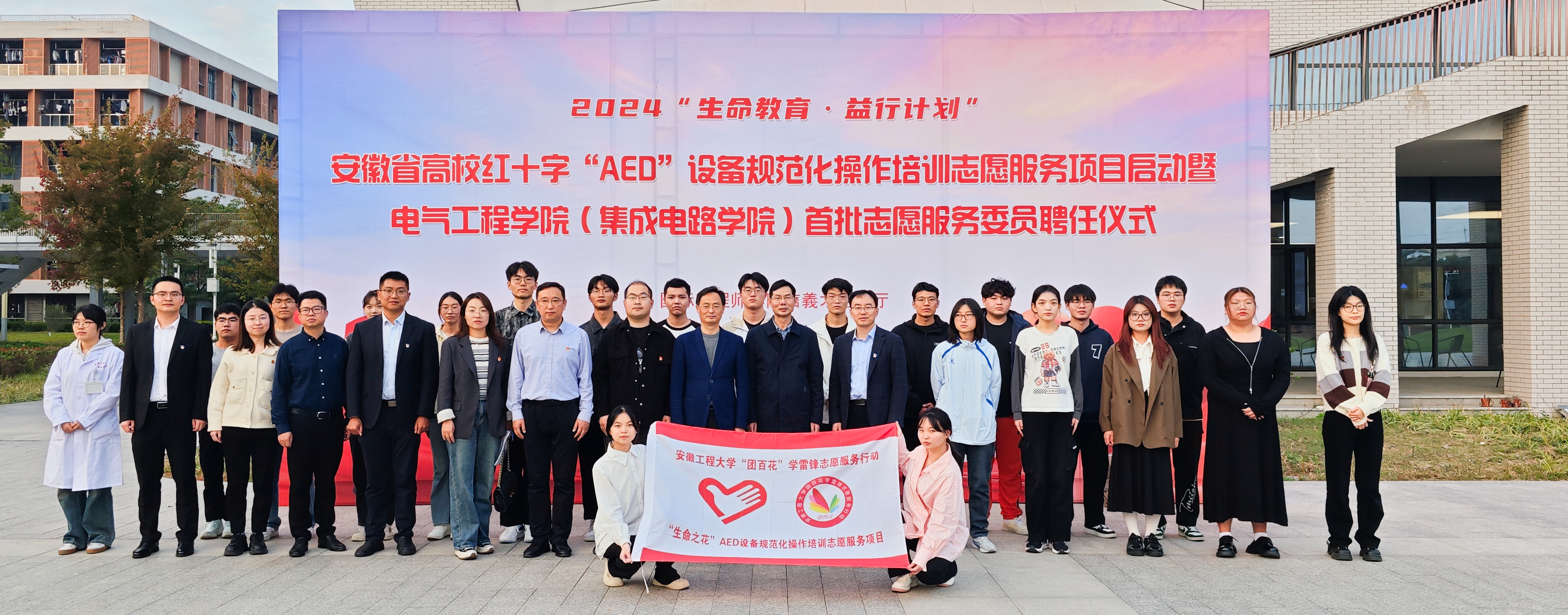 为进一步提高全体师生的应急救护能力,强化师生志愿服务意识,充分发挥新一届团学组织和学院“一站式”学生社区服务功能,11月13日,电气工程学院(集成电路学院)在国际工程师学院校区信义才艺大厅启动2024“生命教育·益行计划”安徽省高校红十字“AED”设备规范化操作培训志愿服务项目暨学院首批志愿服务委员聘任仪式。学院党委书记杨会成、国际工程师学院和谐学生社区党委书记郭全根、皖南医学院第二附属医院纪委书记吴金庭校团委兼职副书记姚伟波、芜湖市运达轨道交通建设运营有限公司团委副书记夏孟以及相关负责人和200余名师生代表出席活动。仪式由安徽省高校红十字“AED”志愿项目负责人阳岚主持。