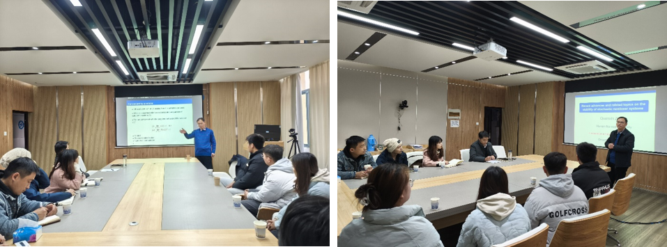 朱全新教授主要从事马氏过程、随机非线性系统的稳定与控制理论及应用研究工作。本次学术报告题为“随机非线性系统稳定性的研究进展及相关问题”。朱教授在报告中主要介绍了随机稳定性的一些经典定义和经典结果,然后介绍了朱教授团队在这个领域的最新研究结果和研究方法。最后,朱教授提出了今后随机非线性系统稳定性的研究问题和研究方向。报告深入浅出,富有启发,赢得了在场师生的热烈反馈。在座的师生就相关研究问题和朱教授进行了深入的探讨和交流。