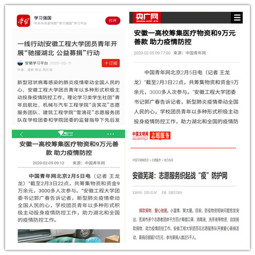 今年新冠疫情发生后不久,学院志愿者团队积极响应党的号召,发起“驰援湖北 公益募捐”活动,他们借助互联网在微信朋友圈、QQ空间,向广大师生与社会人士介绍一线疫情及物资急需情况,发起公益募捐并建立专题网页和“进度公示群”,便于参与募捐者及时跟进到善款使用情况、物资输送情况。30多天的时间里,团队直接和带动RayBetApp官网下载 师生筹集近20万元资金,对接18所高校爱心团队和社会公益组织,联系采购近十批医疗物资,及时送达20多家湖北基层医院。同时,他们还协助校医院收集国家批准的正规医疗物资生产厂家、销售商供货信息或防控物资。相关事迹不仅学习强国、央广网、中国文明网、中国青年报、中国教育新闻网、安徽共青团、安徽教育网等媒体进行关注报道,山东大学共青团、自媒体“补壹刀”等也对募捐事迹进行报道。团队队长也荣获2019年度“全国优秀共青团员”。