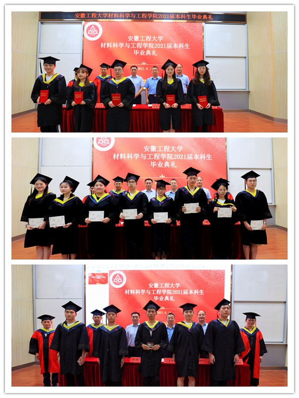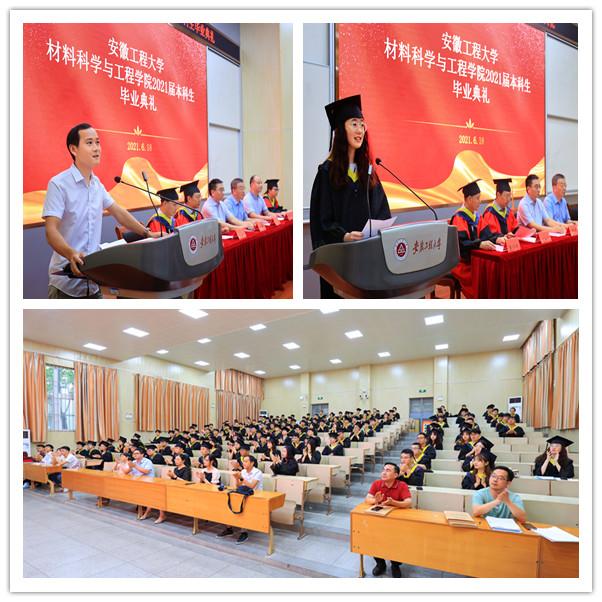 院党委书记王勇智宣读《材料科学与工程学院2021年安徽省普通高等学校优秀毕业生名单》,希望受表彰的同学们发扬成绩,再接再历,今后以实际行动为母校争光。院长左如忠宣读《关于表彰材料科学与工程学院校2021届优秀毕业生的决定》,希望同学们修身立德、刻苦学习、勇于实践。副院长朱协彬宣读《材料科学与工程学院2121届毕业生报名应征入伍名单》并现场赠送纪念品。