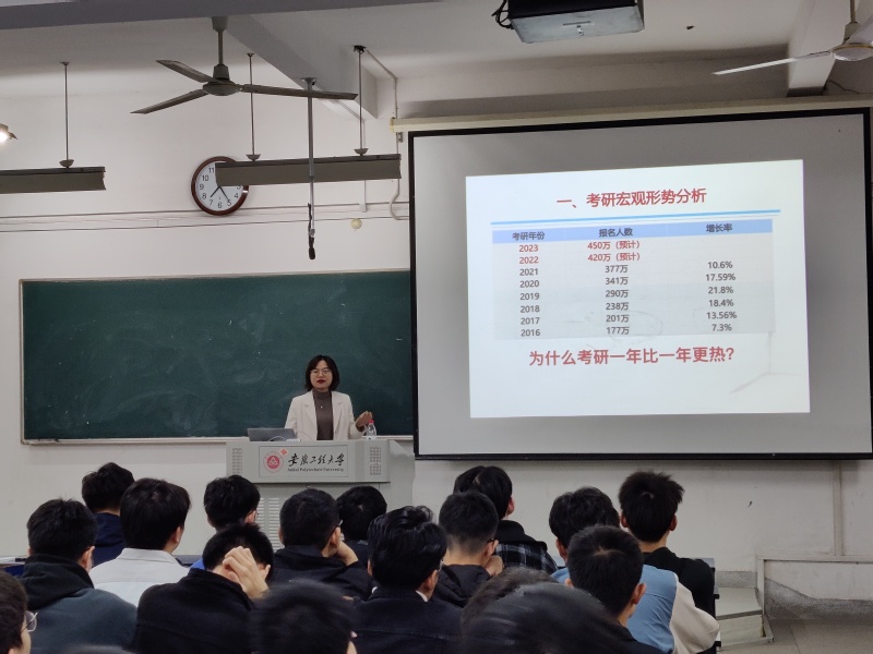 讲座第二部分由吴宗富公司金牌考研讲师杨夏为全体19级学生带来一堂“23届考研全流程解析”讲座,她从考研宏观形势分析、院校专业选择方法、初试科目备考方案、考研关键点环节四个部分展开了深入浅出的讲解,多角度分析了考研全过程所需应对的各种重点与难点,为有意考研的同学们指明了学习的方向,帮助他们树立信心、端正心态,做足准备来迎接考研的挑战。