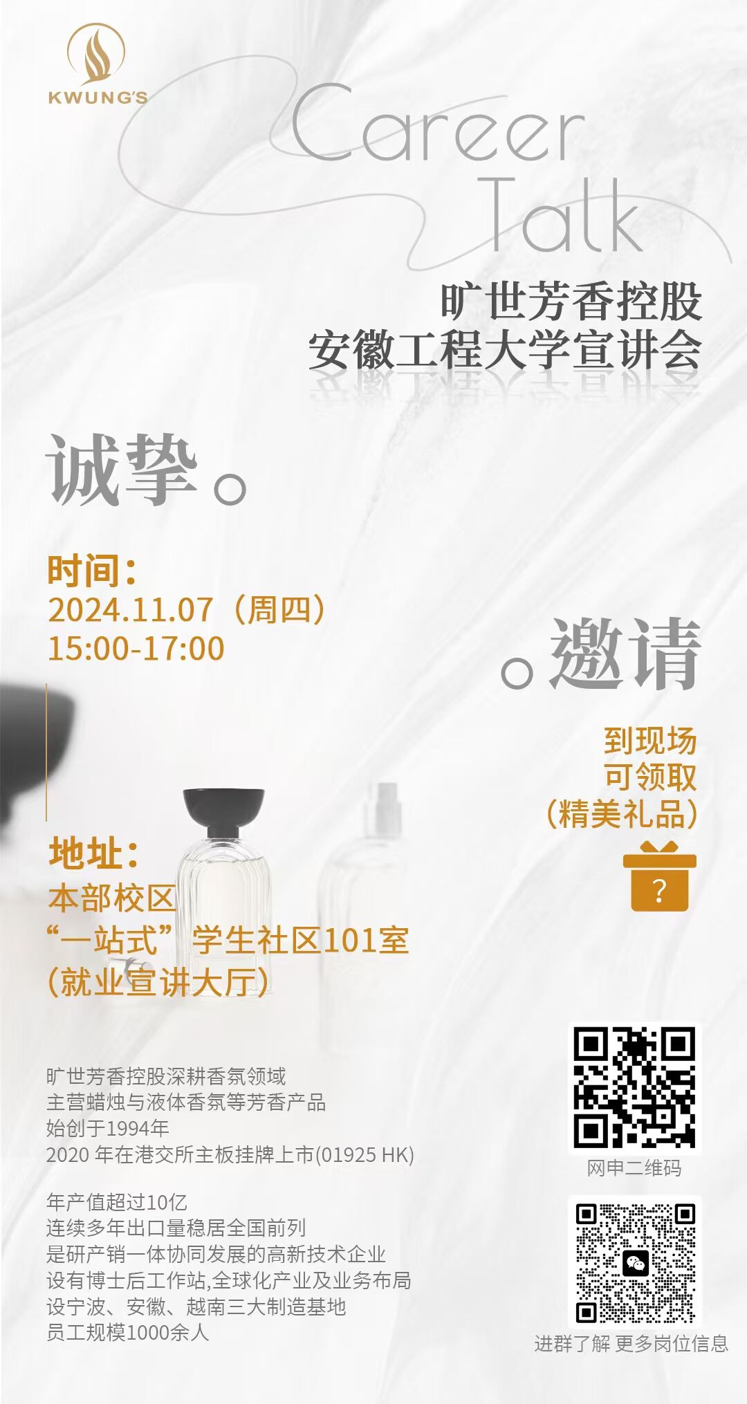 | 5 | 2024年11月7日下午15:00 | 一站式”学生社区101室(就业宣讲大厅) | 旷世芬香控股 | |