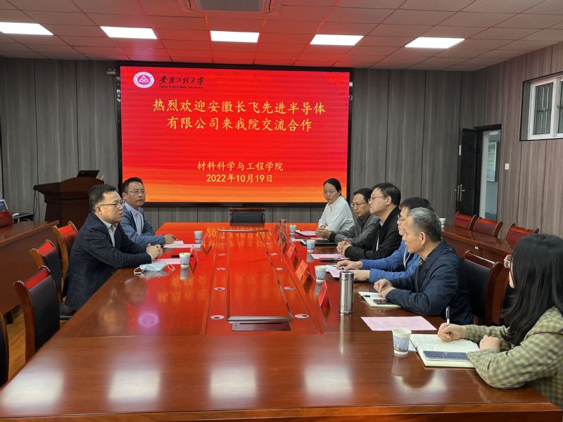 10月19日下午,安徽长飞先进半导体有限公司研发总监钮应喜、项目经理袁松到材料科学与工程学院开展产学研合作交流。材料科学与工程学院院长左如忠、副院长朱协彬、刘琪参加会议,副校长叶常林、教务处处长周晓宏到会指导。