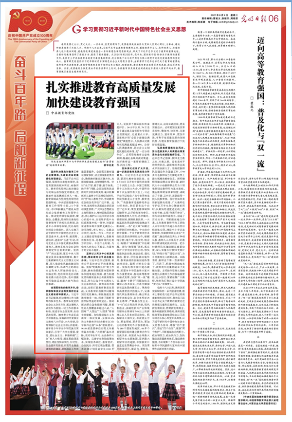教育是国之大计、党之大计。一百年来,在党的领导下,教育为革命、建设和改革培养了大批人才。党的十八大以来,习近平总书记高度重视教育工作,围绕培养什么人、怎样培养人、为谁培养人这个根本问题,就教育改革发展提出一系列新理念新思想新观点,形成了习近平总书记关于教育的重要论述,为新时代教育指明了前进方向、提供了根本遵循。从2016年到2020年,党中央、国务院印发46份关于教育的重要文件,是历史上中央给教育系统发文最密集的阶段,充分体现了以习近平同志为核心的党中央优先发展教育的坚定决心。教育部党组坚持以习近平新时代中国特色社会主义思想为指导,全面落实习近平总书记关于教育的重要论述和党中央决策部署,团结带领教育系统干部师生牢记嘱托、砥砺奋进,推动教育事业取得历史性成就、发生历史性变革。目前,我国教育总体发展水平跃居世界中上行列,各级教育普及程度达到或超过中高收入国家平均水平,教育面貌正在发生格局性变化。