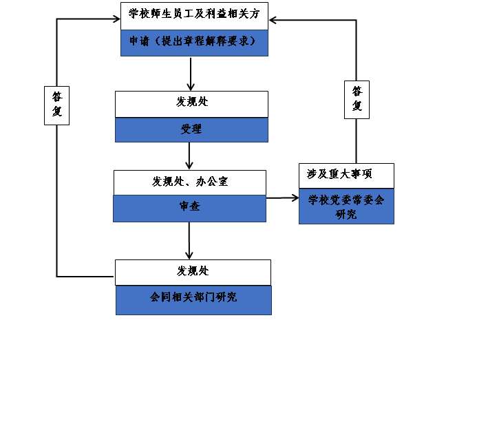 经审查后,认为不需要作进一步解释的,及时告知申请人并说明理由。认为有必要作进一步解释的,且在学校职权范围内能够解释的,由发规处会同相关部门研究后给予答复;其中涉及重大事项的,报学校党委常委会研究后给予答复。