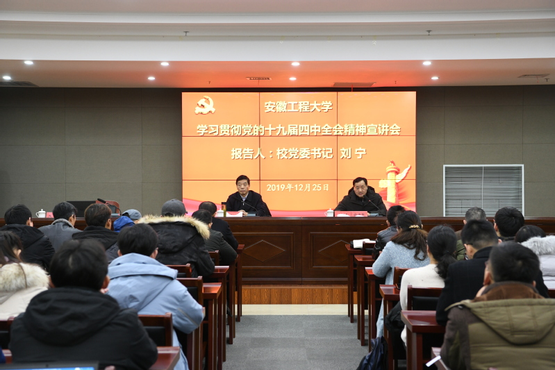本网讯12月25日,校党委书记刘宁作题为《学习贯彻党的十九届四中全会精神 推进学校治理体系和治理能力现代化》专题报告,宣讲党的十九届四中全会精神。各学院党委副书记、团委书记、组织员,各学院党支部书记代表、学生党员代表,宣传部、组织部科级以上干部参加。会议由校党委常委、宣传部部长孙浩然主持。