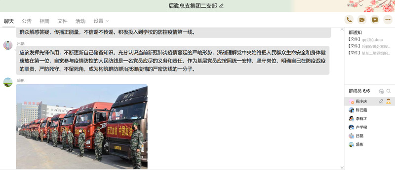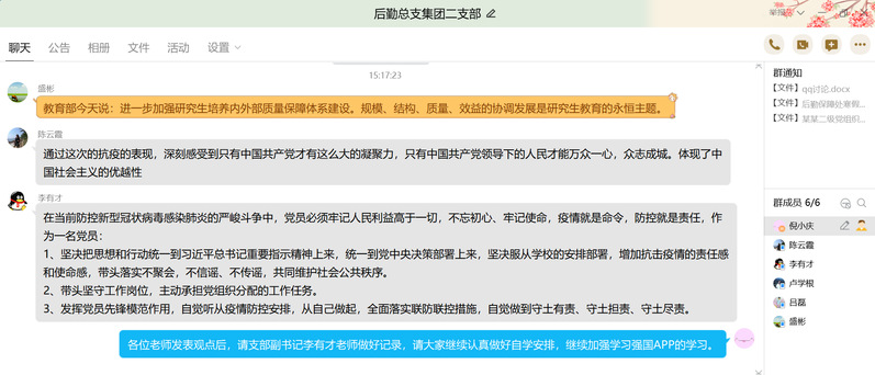 本网讯疫情防控期间,为进一步提高党支部的战斗力,按照学校党委统一部署,在总支2月中旬布置学习任务后,集团二支部第一时间将学习内容通过QQ群发布,提前布置学习任务,要求各位党员居家自学,并将思考题布置到每位党员,共同商定时间召开网络支部学习讨论会。