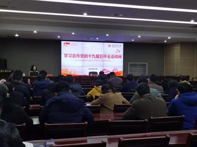 为深入学习贯彻党的十九届五中全会精神,12月25日,机关党委在图书馆202会议室举行党的十九届五中全会精神专题辅导报告会,马克思主义学院彭鸿雁教授应邀作报告,机关党委理论学习中心组成员及机关党委党支部班子成员参加。报告会由机关党委书记王弘主持。