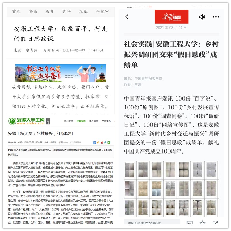 本网讯近日,以“百年乡村变迁与乡村振兴发展”调研团为代表的人文学院“致敬百年”网络主题教育活动经验做法先后在学习强国、中国青年报、安青网、安徽大学生网等主流媒体上报道。