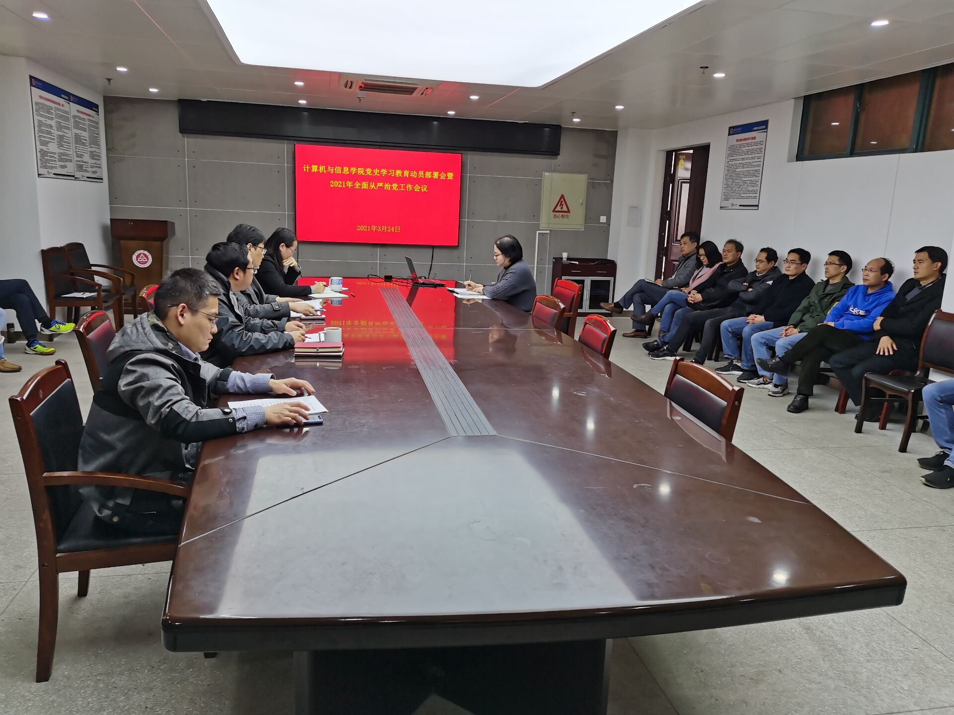 李卫东通报了《计算机与信息学院党史学习教育工作方案》《计算机与信息学院全面从严治党重点工作任务清单》。他强调,党史学习教育是一项重大政治任务,贯穿2021年全年。在学习教育中,要突出学史明理、学史增信、学史崇德、学史力行,做到学党史、悟思想、办实事、开新局,通过党委中心组学习、教职工政治学习、支部三会一课、主题党日活动等丰富学习方式,和新一轮深化“三个以案”警示教育结合起来,切实抓好专题学习、交流研讨和宣传阐释等掀起学习贯彻的热潮。支部党员要结合全面从严治党要求,坚持自学和集体学习相结合,深刻理解把握习近平在党史学习教育动员大会上的重要讲话精神,树立正确的党史观,牢记和践行党的初心和使命,为群众办实事解难题。李卫东还通报了巡视整改有关工作情况,希望全体教师在学院领导班子的带领下,以饱满的精神状态,围绕省委巡视整改要求,认真开展国家级一流专业建设和工程教育认证等重点工作,切实发挥党建思想引领和政治保障功能,为学院“十四五”开好局、起好步,推动学院高质量发展。