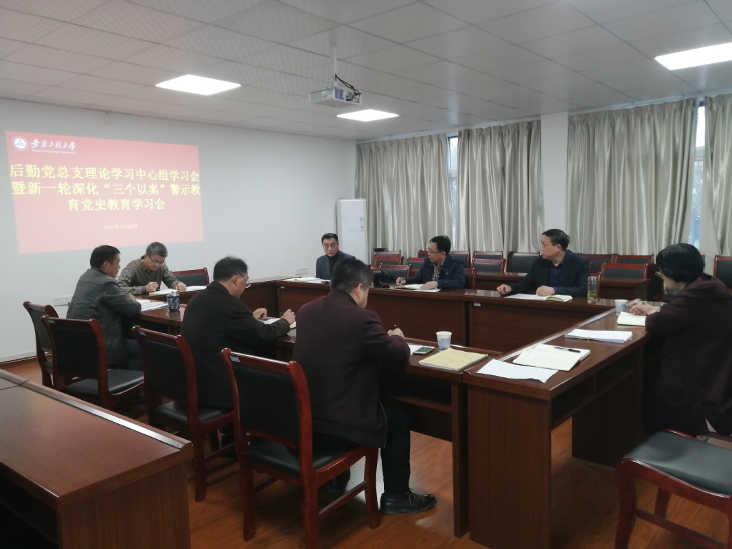 本网讯3月26日下午,后勤党总支在后勤保障处207会议室召开理论学习中心组学习会暨新一轮深化“三个以案”警示教育和党史教育学习会,校党委常委、副校长郑健到会参加指导,总支理论学习中心组全体成员参加,会议由后勤党总支书记纪天新主持。
