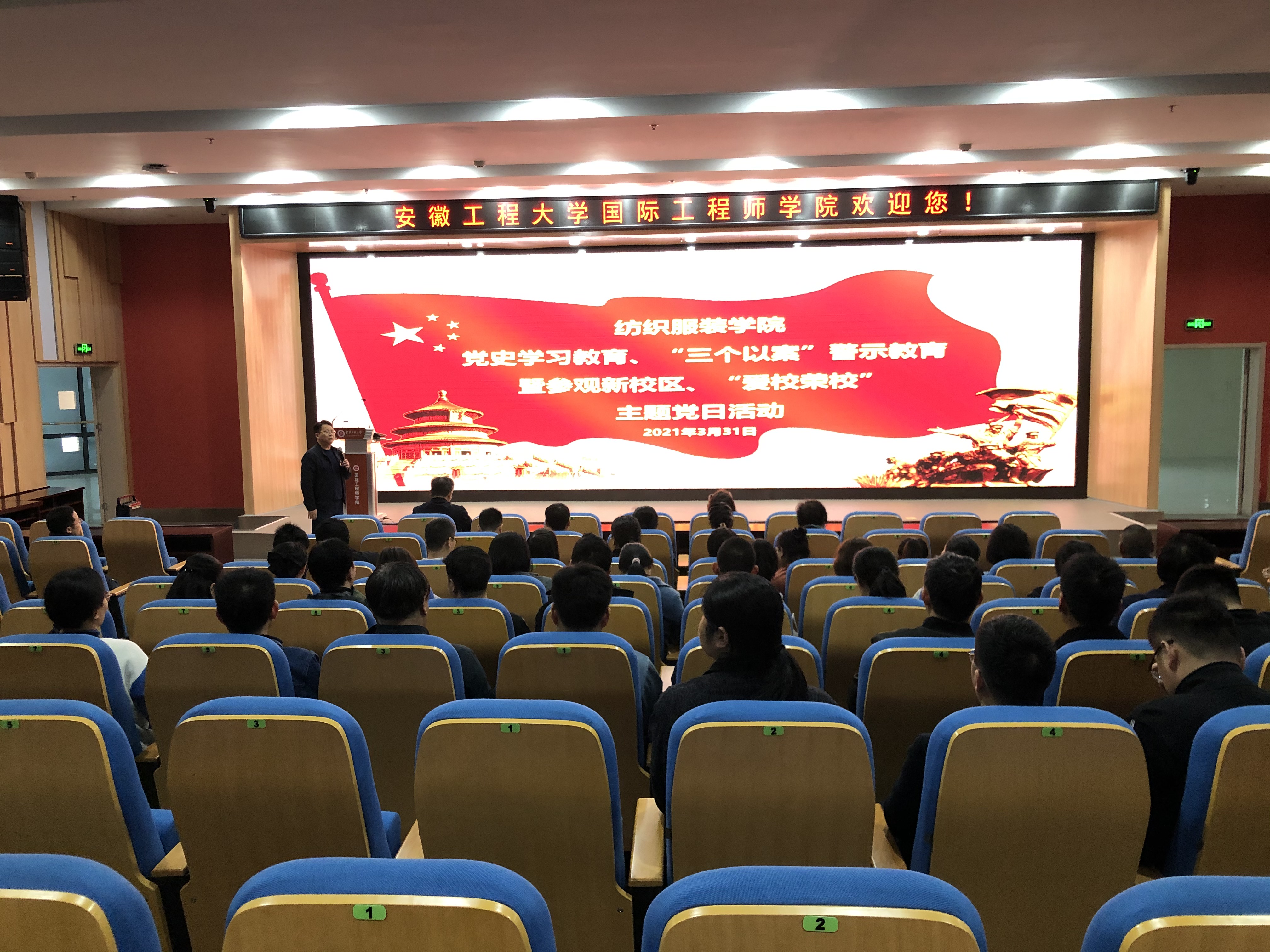 本网讯3月30日下午,纺织服装学院组织全体教职工前往新校区国际工程师学院,开展党史学习教育、“三个以案”警示教育暨“爱校荣校”主题党日活动。纺织服装学院一行受到了国际工程师学院校区管委会常务副主任魏长顺、配建办副主任陈阳、管委会综合科科长王中江等热情接待。