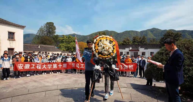 仪式结束后,新四军军部旧址纪念馆专家为学员讲授“学党史 开新局 讲好红色故事”专题报告;学员在泾县开展“赓续红色基因 凝聚前行力量”党史学习教育实践教学,集体参观军部司令部(种墨园、大夫第)、旧址军部大会堂(陈氏宗祠)旧址等;学员在叶挺铜像前集体重温入团誓词,向革命先烈敬献花篮,朗诵《新四军军歌》。