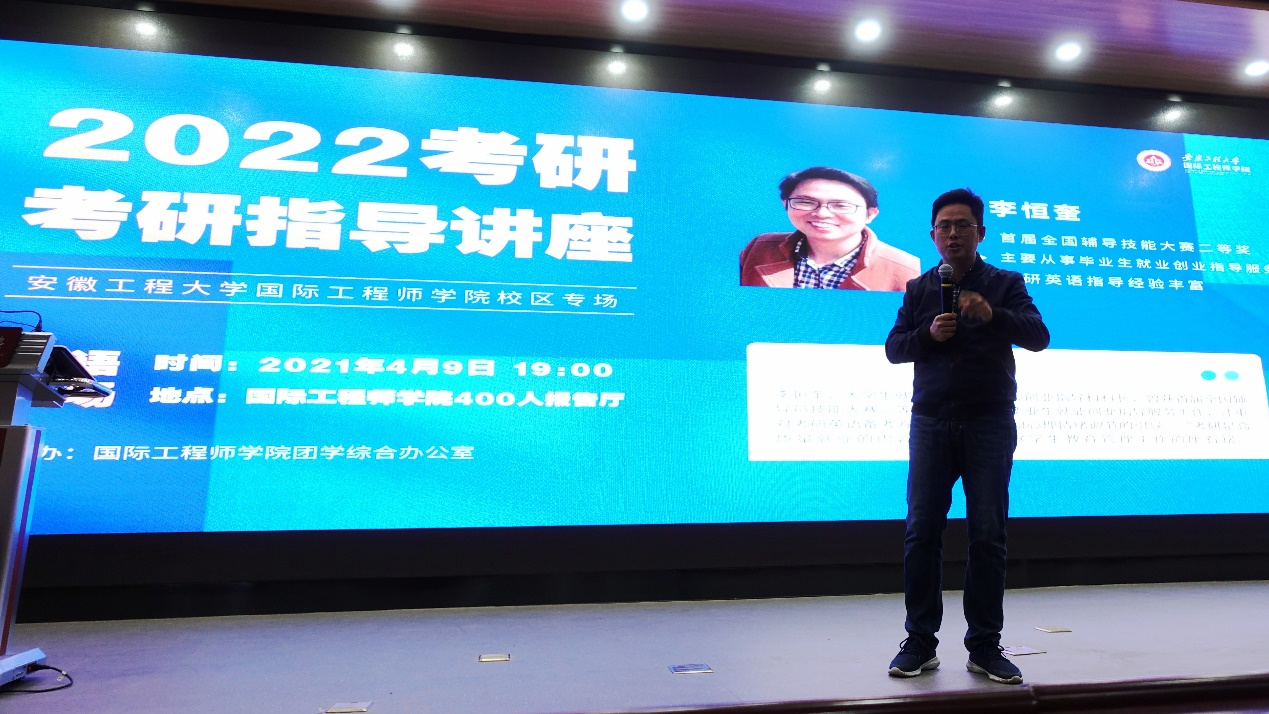本网讯为加强国际工程师学院校区学风建设,做好学生考研指导服务。校团委邀请数理与金融学院潘海峰、大学生就业创业指导中心李恒奎、马克思主义学院陈一超三位老师在国际工程师学院大报告厅先后开展三场考研指导讲座。