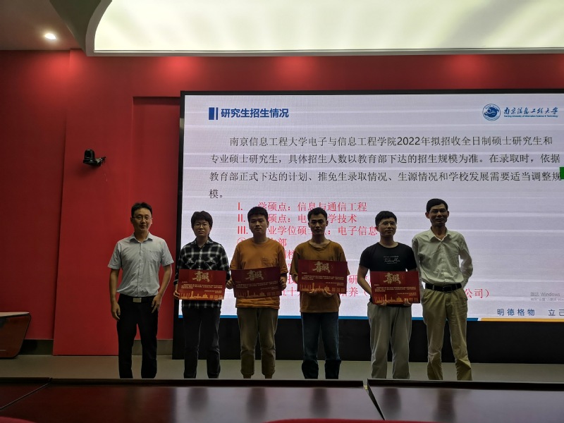 万发雨对学院优质生源的培养表达了感谢,双方共建了研究生优质生源基地。他从学科特色、科研概况、师资队伍、研究生招生录取情况及校园生活等五个方面展开了介绍,还就同学们关心的“研究生待遇”“考试政策”等内容向在座同学进行了详细的说明,并结合自己的成长经历,鼓励大家勇敢尝试、努力奋斗、永不言弃。在与会师生的共同见证下,双方共同为我院考取南京信息工程大学的优秀学生代表颁发喜报。同学们纷纷表示,通过这次宣讲交流会,使我们对南京信息工程大学的基本情况及研究生招生政策、培养模式有了进一步了解,同时引领我们在考研的道路上,坚定决心,努力前行,争取在考研中取得优异的成绩。