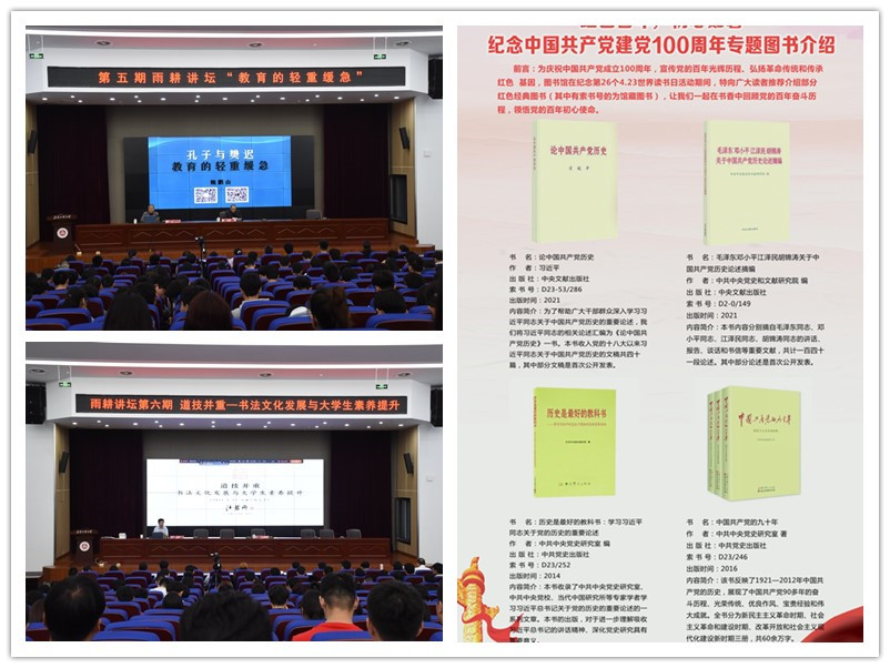图书馆坚持用社会主义核心价值观引领知识教育、引领师德建设,加强党史、国史、改革开放史、社会主义发展史教育。在中国共产党成立100周年之际,图书馆通过微信公众号特推出有关中国共产党史、新中国史、改革开放史、和社会主义发展史的书目,供大家学习。图书馆公众号从四月至今已推荐多本相关书籍,如《建党伟业》、《中国共产党图史》、《共产党宣言》等。