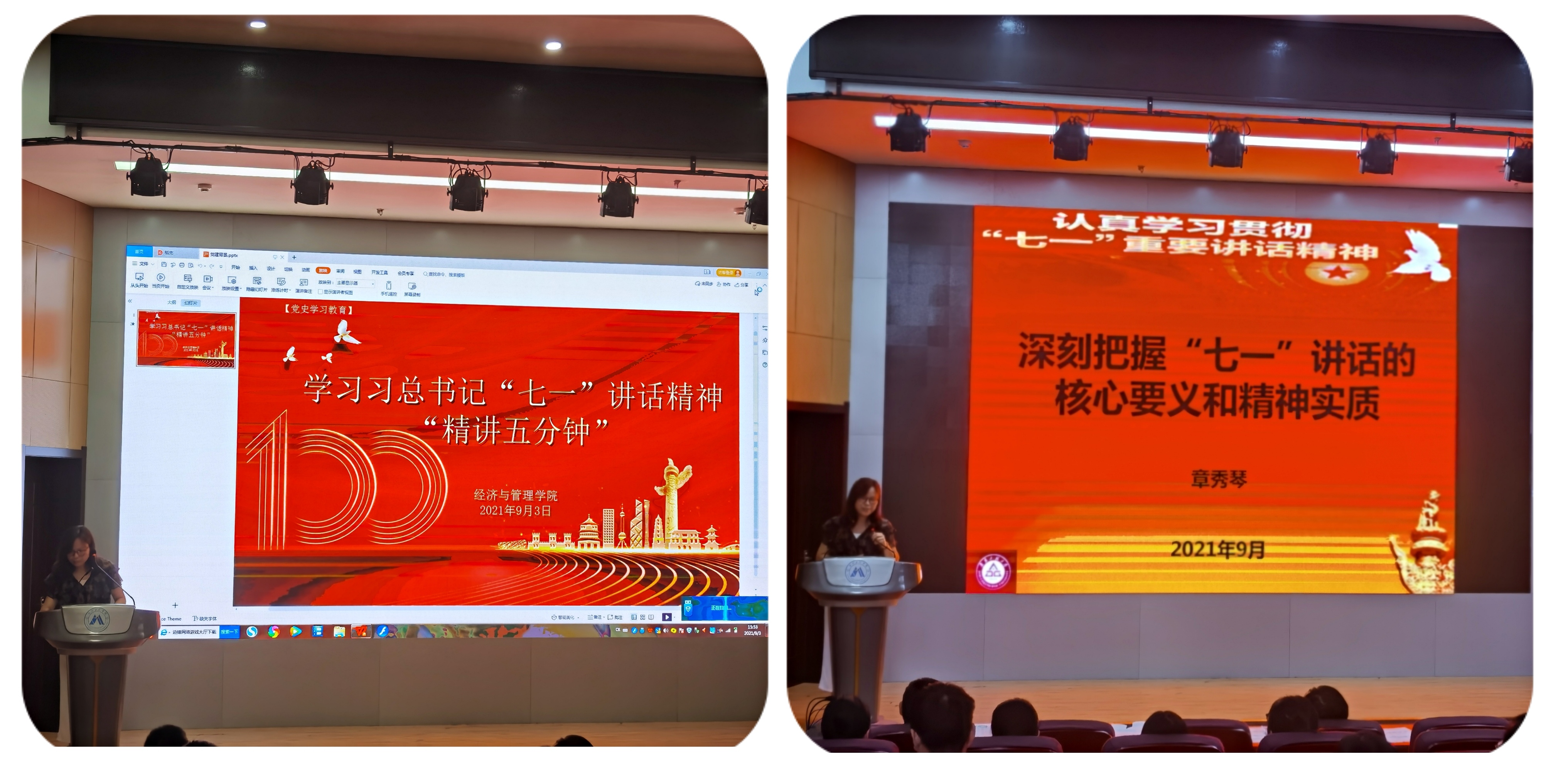 本网讯9月3日,为深入学习贯彻习近平总书记“七一”重要讲话精神,提升政治理论学习成效,交流展示理论学习成果,引导学院全体教职工以更加昂扬向上的精神状态奋进新时代、走好新征程,经济与管理学院党委利用教职工周三学习时间组织开展学习习近平总书记“七一”讲话精神“精讲五分钟”系列沙龙活动。