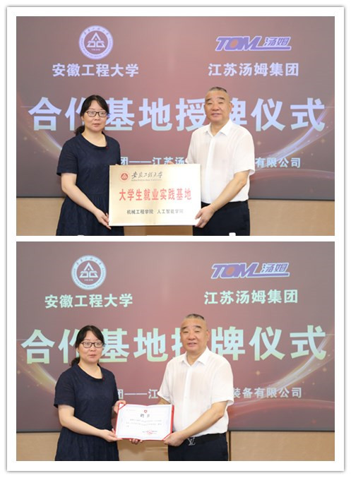 伊长文代表学院与汤姆集团签订了人才培养与就业基地合作建设协议书。李文江代表学院授予江苏汤姆公司大学生就业实践基地铜牌,同时聘请汤建华为我院大学生创新创业教育导师库专家。