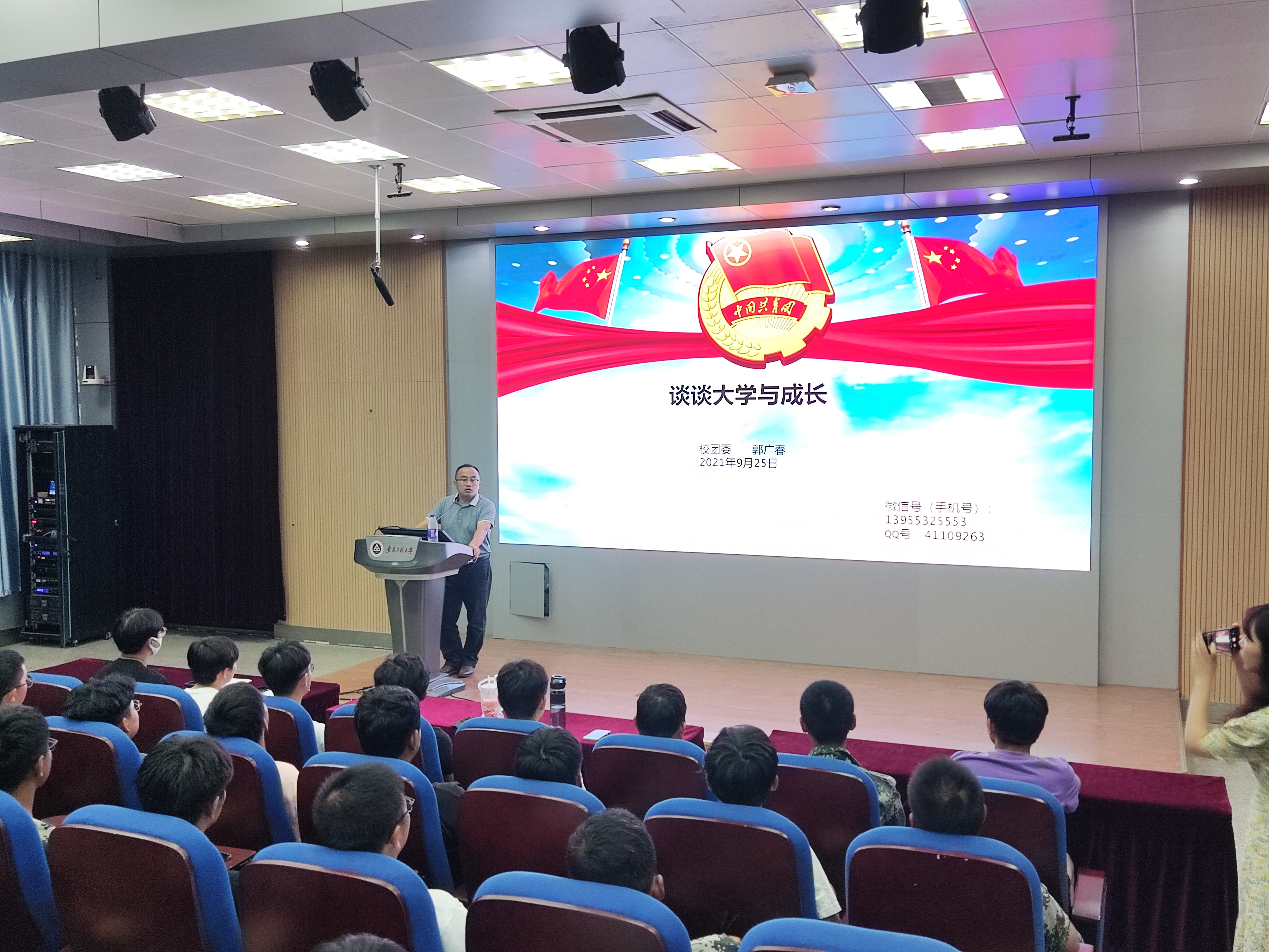 不忘初心与使命,从百年党史中汲取智慧和力量,刘德军则通过“读《论中国共产党历史》悟大学生成才之路”勉励新生学子要加强党史学习,积极继承党的成功经验和优良传统,并以实际行动积极向党组织靠拢。闫石以“礼仪与沟通”为主题,通过诙谐幽默的语言向学生讲解了正确的礼仪与沟通方式知识。郭广春从两个第一次、至少“两个没有”、一个理想与抱负、学习与实践入手与新生学子共话“大学与成长”,勉励新生学子要做最新的安工程人、做最勤的安工程人、做最美的安工程人。周宇航、潘颢及李增产三位优秀学长分别从志愿服务、网络信息素养及网络安全、学习方法掌握及学习习惯培养等方面进行了经验分享,充分发挥了学生先进典型的示范引领作用。