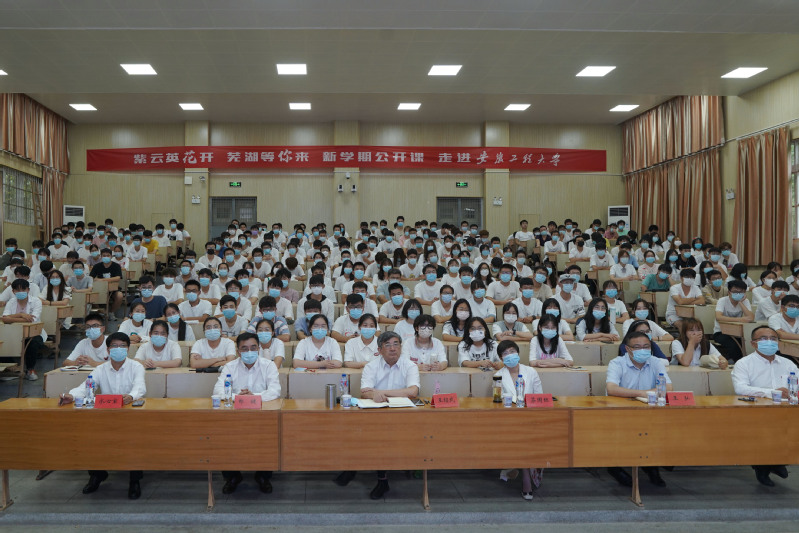 本网讯9月29日由中共芜湖市委、市人民政府主办,芜湖市委组织部(市人才办)、宣传部、人社局、教育局、人才发展集团共同承办的“紫云英花开 芜湖等你来”新学期公开课开讲,主课堂设在安徽师范大学花津校区实习实训中心一楼报告厅,本次公开课由芜湖市委书记、市人大常委会主任单向前担任主讲。在芜各高校、中职(技工)学校、市外芜湖市高校人才工作站所在高校设线上分课堂,20余万在芜大学生通过线上线下共上新学期公开课。我校设立分会场,各二级党组织和各学生组织在多个报告厅和教室收听收看了直播。校党委副书记、校长王绍武,校党委副书记苏国红,校党委常委、副校长郑健在2教报告厅分会场收听收看。