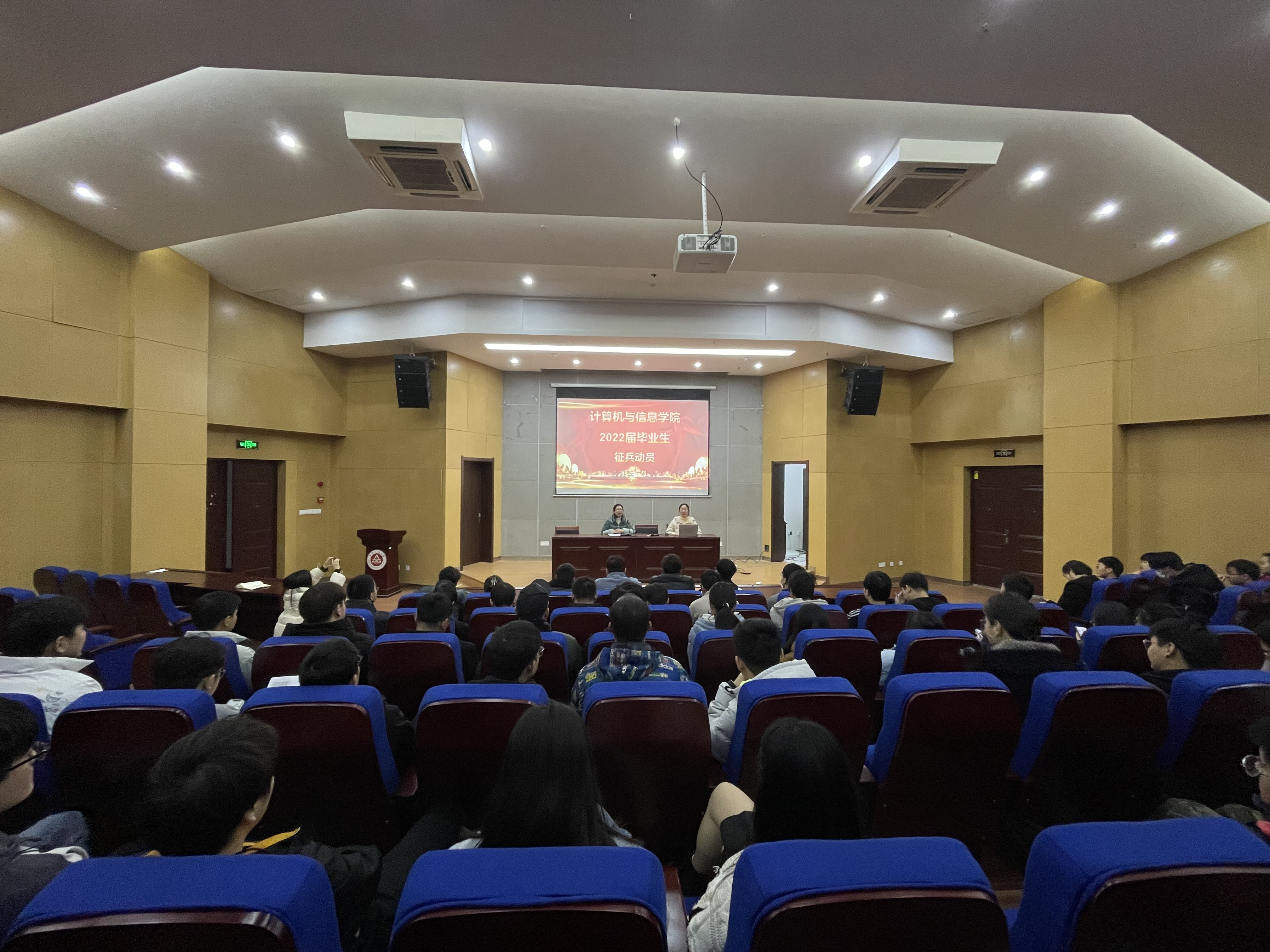 本网讯为全力做好大学生特别是高校毕业生征兵工作。12月16日上午,计算机与信息学院在实验楼C座5楼报告厅召开2022届毕业生征兵动员大会。院党委副书记孙德茹、校保卫处征兵工作站负责人赵成婧、学院征兵负责人王鸣鹃和毕业班辅导员、部分学生代表参加了会议,同时邀请学生家长通过线上直播形式参与。会议由孙德茹主持。