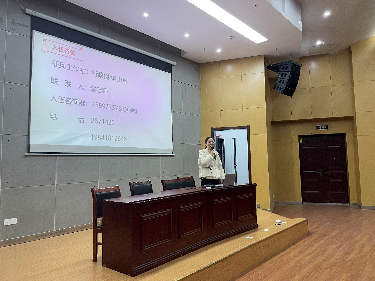 赵成婧就征兵条件、参军优待政策、应征流程、常见问题等做了详细介绍和说明,学校将结合疫情防控形势,常态化设置征兵工作站,优化工作机制,畅通大学生入伍绿色通道。她指出,希望广大青年学生能够积极投身到国防建设中去,将爱国之心转化为报国之行,心怀报国之志,为国防建设奉献自己的力量。