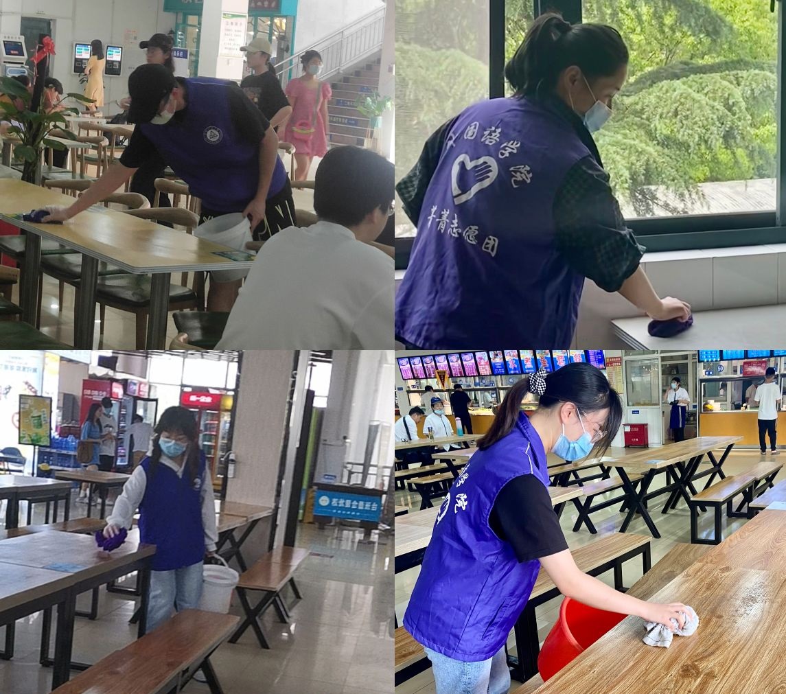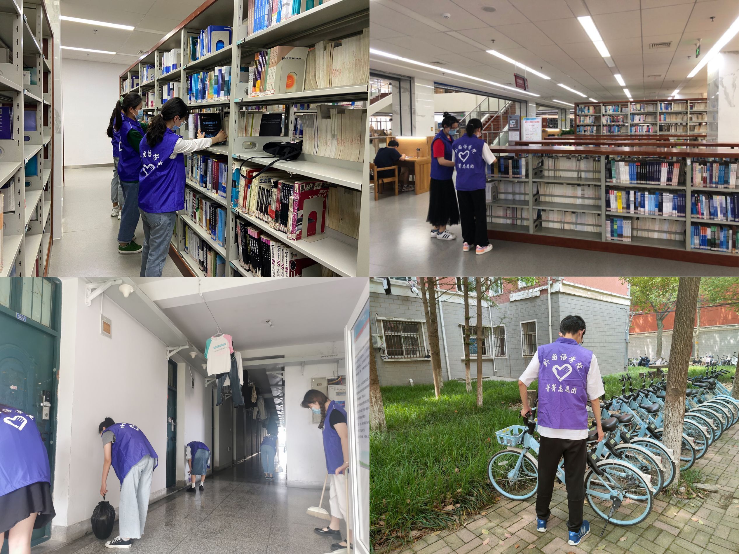各小组分工明确,按时到达指定地点,井然有序地开展活动。在图书馆,志愿者们把读者还回的图书按类别推到不同的楼层,分类排序,依次上架;在6教教室,志愿者们擦去黑板上的字迹、抹去讲台上的灰尘并清理掉课桌桌肚中的垃圾;在女生1栋和7栋宿舍楼,志愿者们将楼道里的垃圾集中起来,运送到楼外的垃圾箱;在三、四食堂,志愿者们一手拿着抹布,一手提着水桶,及时清理掉油腻的餐桌垃圾;在校园内,志愿者们按顺序合理摆放共享单车和电动车,方便路人行走。天气炎热,汗水浸透了志愿者们的衣服,但他们洋溢着青春气息的脸上都挂着笑容,保质保量地完成了各项任务。