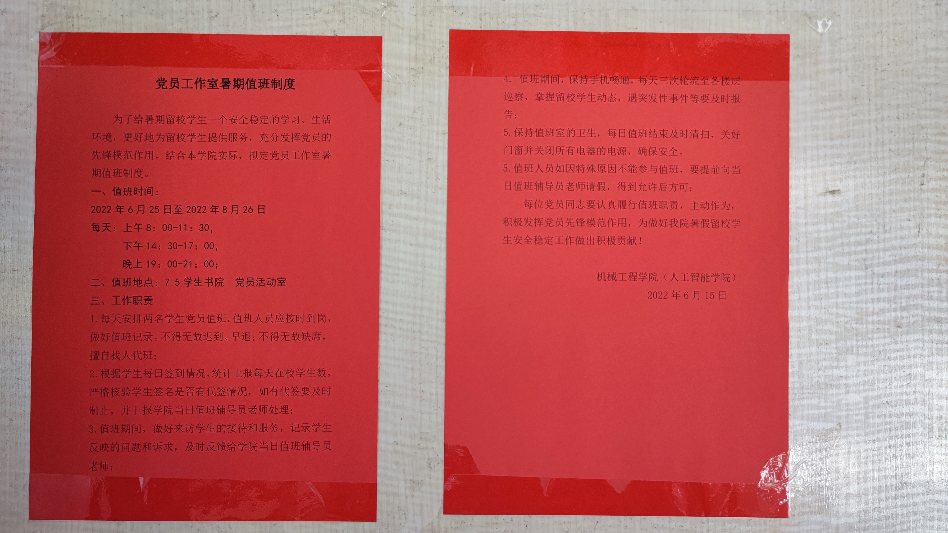 本网讯为给暑期留校学生营造安全稳定的学习、生活环境,提供贴心、周到的服务,机械工程学院(人工智能学院)结合学院实际,制定党员工作室暑期值班制度,充分发挥学生党员先锋模范作用,鼓励、组织学生党员积极参与暑期值班工作,为暑期在校师生提供帮助。