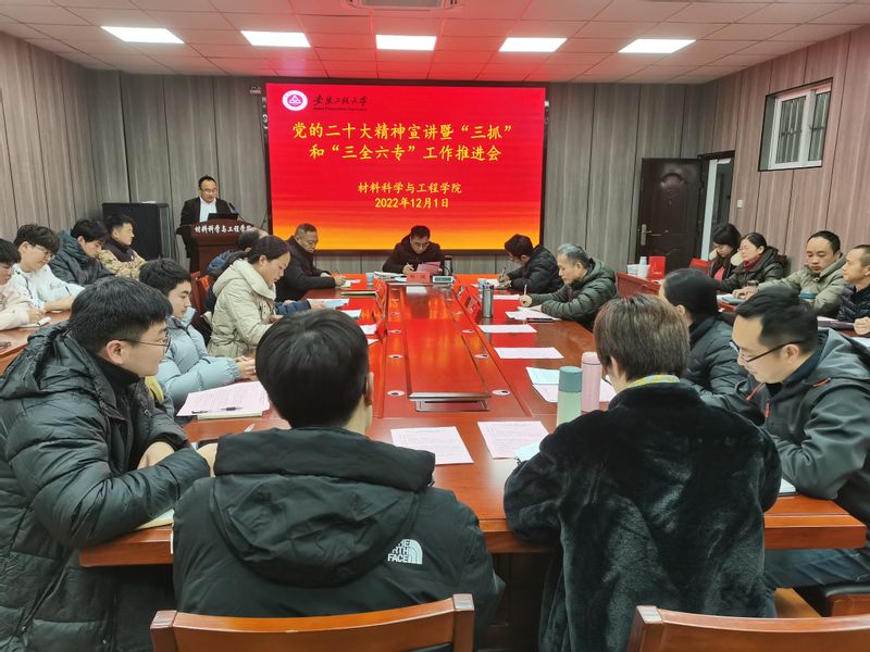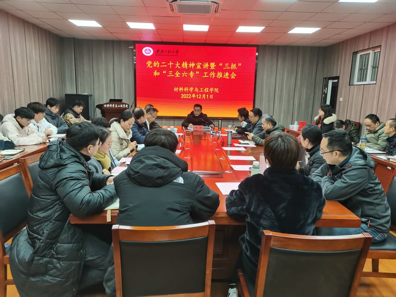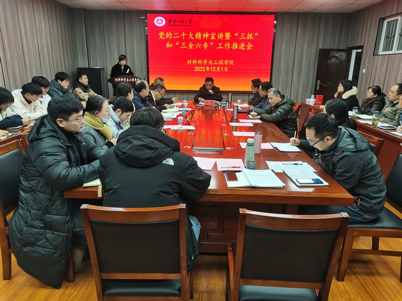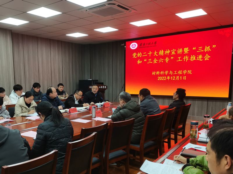 本网讯12月1日下午,校党委常委、副校长郑健在校党委常委、组织部部长王弘,校团委副书记、党委学工部副部长李恒奎陪同下,到材料科学与工程学院调研指导“三抓”和“三全六专”工作,宣讲党的二十大精神。学院党政班子成员、党支部书记、系主任,以及学院党政办负责人、组织员、团委书记、本科教学办公室主任、科研秘书、研究生秘书、辅导员、教学督导员,全体团委、学生会主要学生干部,各班班长、团支书参加调研座谈会。