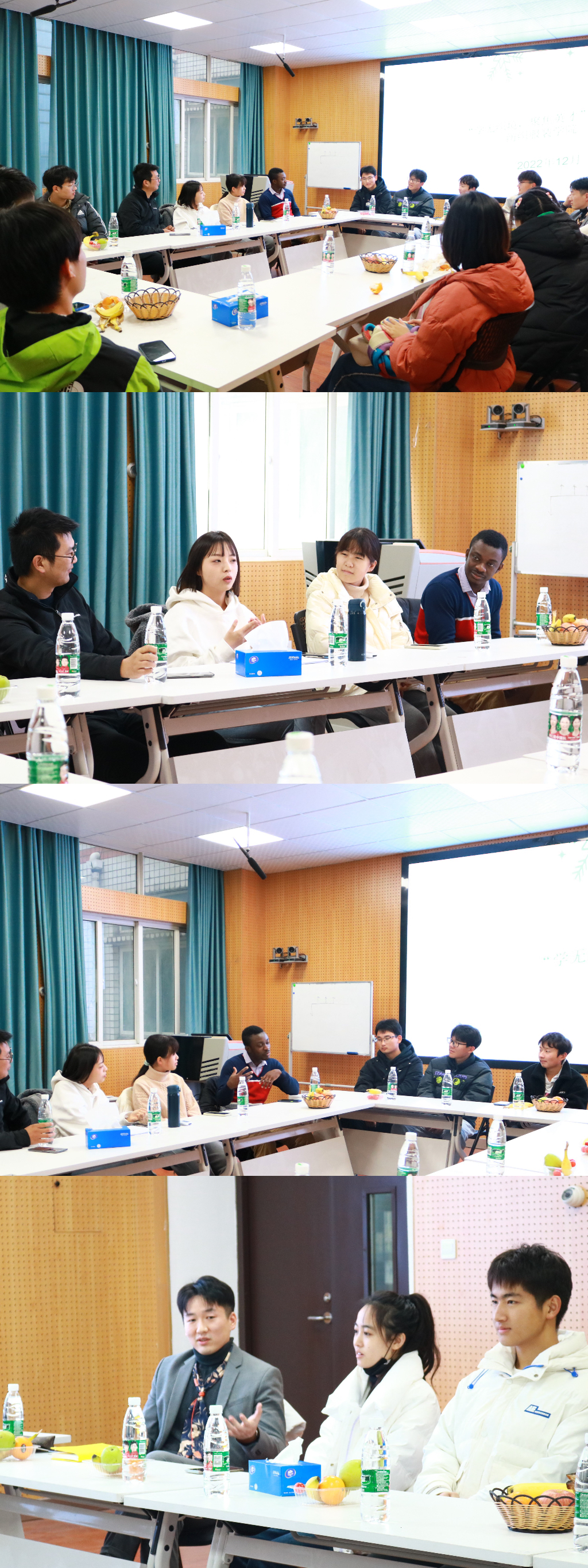 活动采取报名制,每期12个名额,本期活动包括“主题talk”和“你划我猜”等内容,活动现场还精心准备了水果和游戏卡片等。活动开始,汪帝老师介绍了学院举办英语角的背景和初衷,分享了自己对于英语日常交流的看法,鼓励同学们把握学院提供的机会和平台,勇敢踏出第一步、大胆开口说英语。来自加纳的博士后Bismark分享了他的个人经历,他表示,自2015年来到中国接触到中华文化后,对中华文化产生了浓厚的兴趣并选择继续在中国读博深造。孙旭之老师结合自身在韩国留学的经历,鼓励同学们多学习优秀传统文化,勇敢表达自己的观点想法。随后,同学们从兴趣爱好、学习生活、家乡特色等方面与参会师生进行了互动和交流。纺织213孙鑫超现场演绎了著名的黄梅戏曲目《天仙配》,现场掌声不断;纺织222高翔用一口流利的英语为大家介绍了他喜爱的篮球球星。现场氛围其乐融融,同学老师们相谈甚欢。服工221张风在活动结束后表示,大家热情的发言给予了他英语交谈的勇气,这次活动带给他的不仅是闲适的午后聊天时光,更是对他拓宽视野的一次有力帮助,他对下一场活动的举办十分期待。