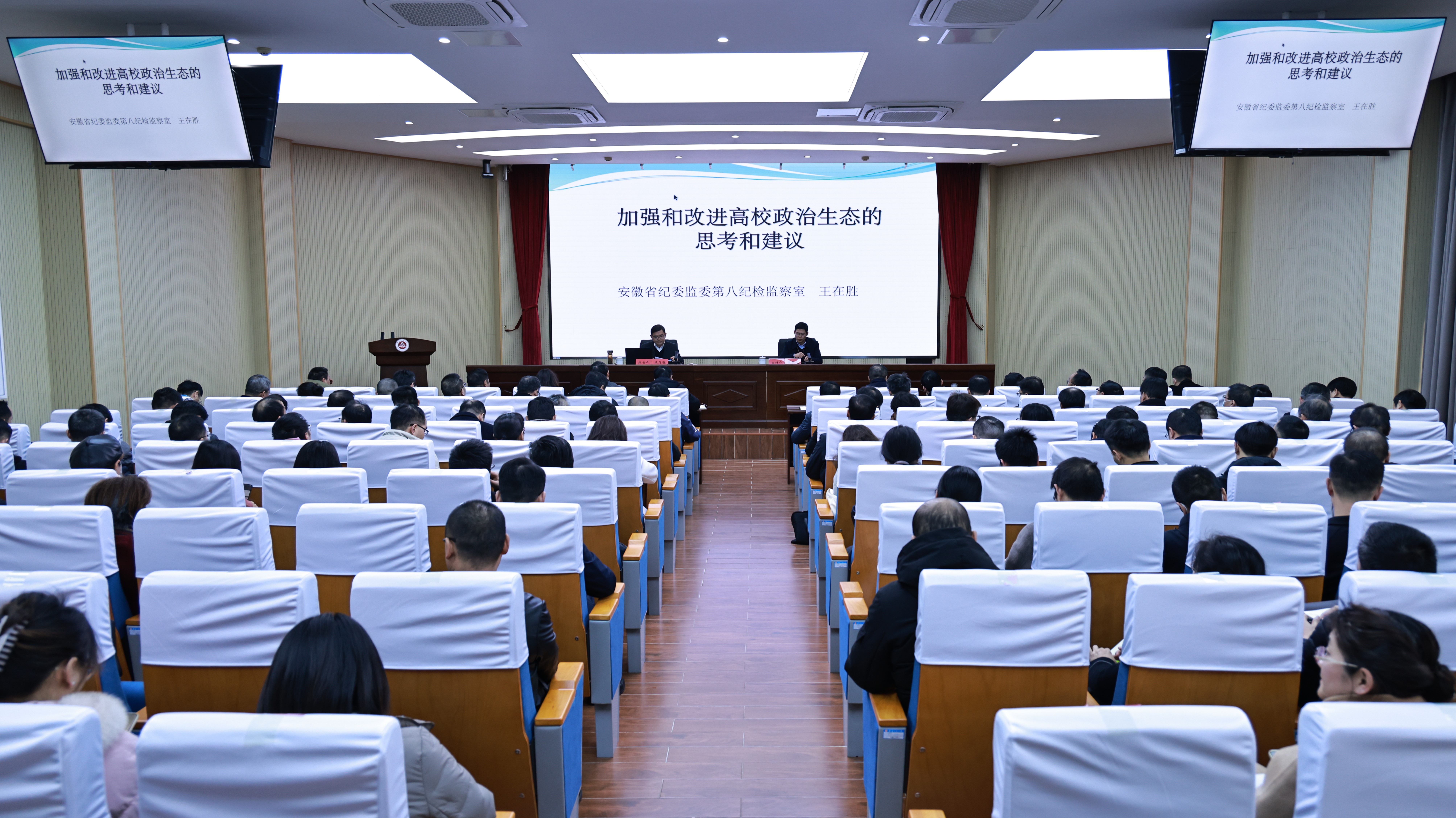 本次培训邀请了省纪委监委第八纪检监察室二级巡视员王在胜,为专兼职纪检监察干部、全体处级干部以及后勤、现代技术中心、国资等部门科级干部作题为“加强和改进高校政治生态的思考和建议”专题辅导报告。他从“高校政治生态存在的问题”“高校全面从严治党存在的问题”“加强和改进高校政治生态的建议”三个方面阐释了对省属高校政治生态现状和改进的思考。