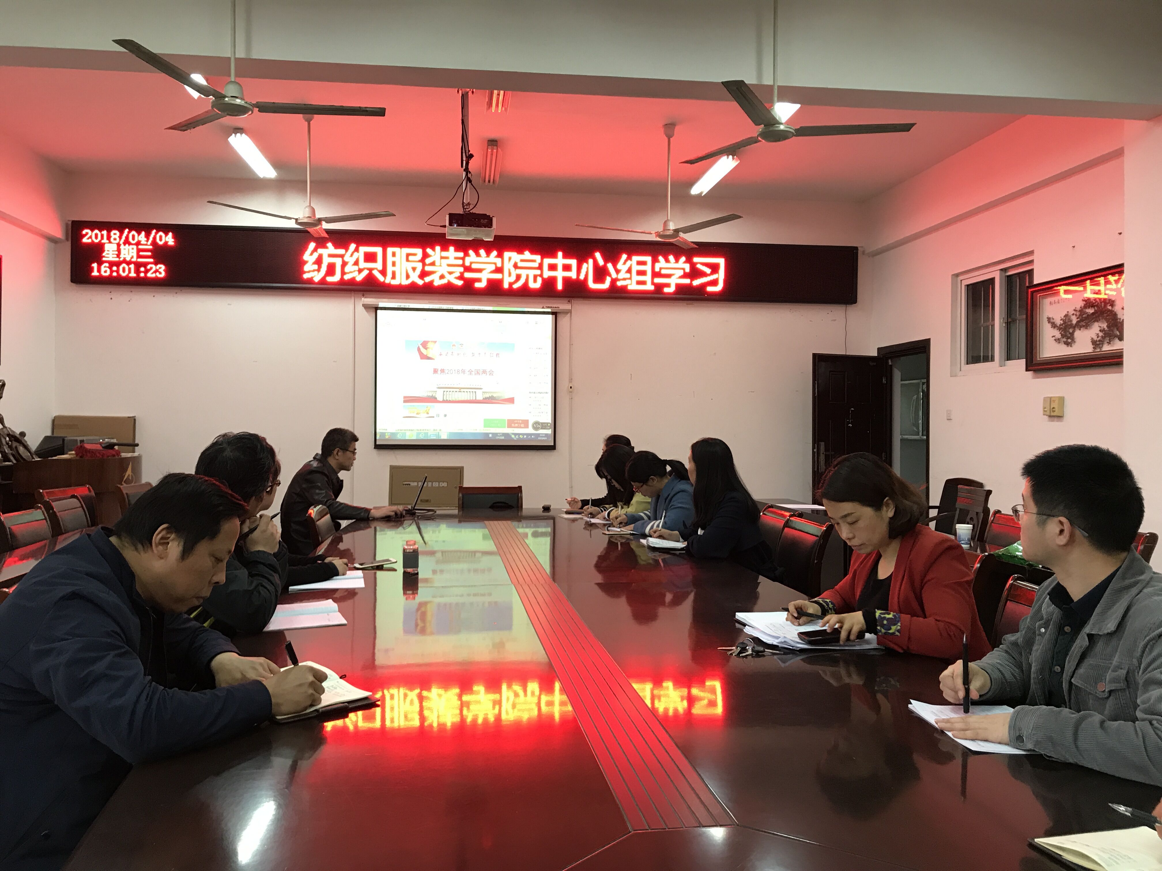 4月4日下午,纺织服装学院在D座412会议室召开党委中心组学习会,学习贯彻十三届全国人大一次会议和全国政协十三届一次会议精神。全体中心组成员参加会议,会议由纪天新主持。
