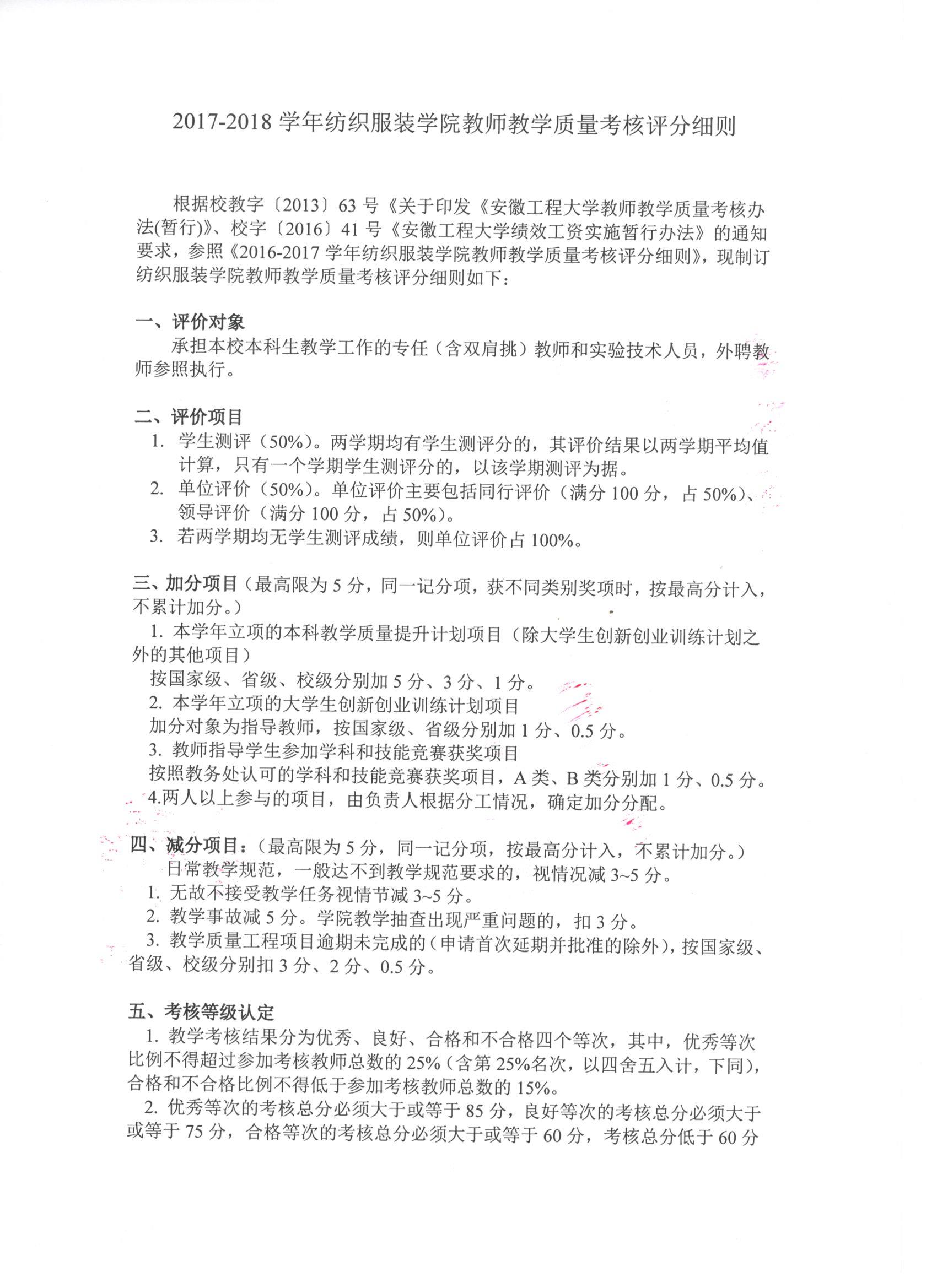 2017-2018学年纺织服装学院教学质量考核评分细则