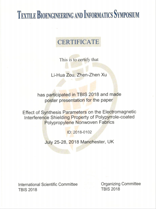 会议从天然纤维的创新、功能纺织品、技术纺织品、设计时尚与零售、纺织处理、颜色、测试、教育等多个角度为参会代表们带来了近百场高质量、高水平的学术报告。其中,天然纤维方面的报告有18场,研究内容包含了棉、麻、毛、竹等;功能纺织品方面的报告有24场,研究内容包含了织物的热湿传输、导电织物、织物穿着舒适性、织物增强复合材料、可穿戴等;技术纺织品方面的报告有14场,研究内容包含了纺织品在生物组织修复中的应用、形状记忆材料、可变泊松比的编织材料、吸能材料、防火材料、过滤材料等;设计时尚与零售方面的报告有14场,包含了文化因素对时装的影响、共享经济对零售业的影响、针织产业的发展等;纺织处理、色彩及教育方面的报告有10场,包含了酶处理技术、节水节能加工技术、色彩对服装的影响、虚拟教学环境对纺织未来教育的影响等内容。通过听取相关报告,了解了目前国际上天然纤维、功能纺织品、技术纺织品、设计时尚与零售、纺织处理、色彩、测试、教育的现状及最新的研究进展。