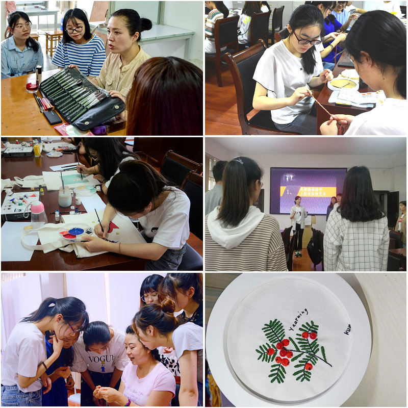 此次锦绣纺服公益计划,同学们对传统刺绣艺术的热情最为热烈,学院增设了两个刺绣班,还为刺绣班的每位同学都配备绣棚、绣线等基本工具。6月1日开始,每到周六,在D座214,都会看到党员教师邬红芳教授带领同学们沉浸在刺绣美学中的身影。邬红芳老师亲切优雅的给同学们讲诉了刺绣的起源、刺绣所包涵的意义、刺绣在历史上的发展以及国内外刺绣的不同之处。随后邬老师又为同学们亲身示范了刺绣的十余种基础针法,并针对每个学员的情况,进行手把手教学。最终,同学们在自己的努力和老师的耐心帮助下完成了人生中的第一件绣品,也度过了充实有意义的周末时光。