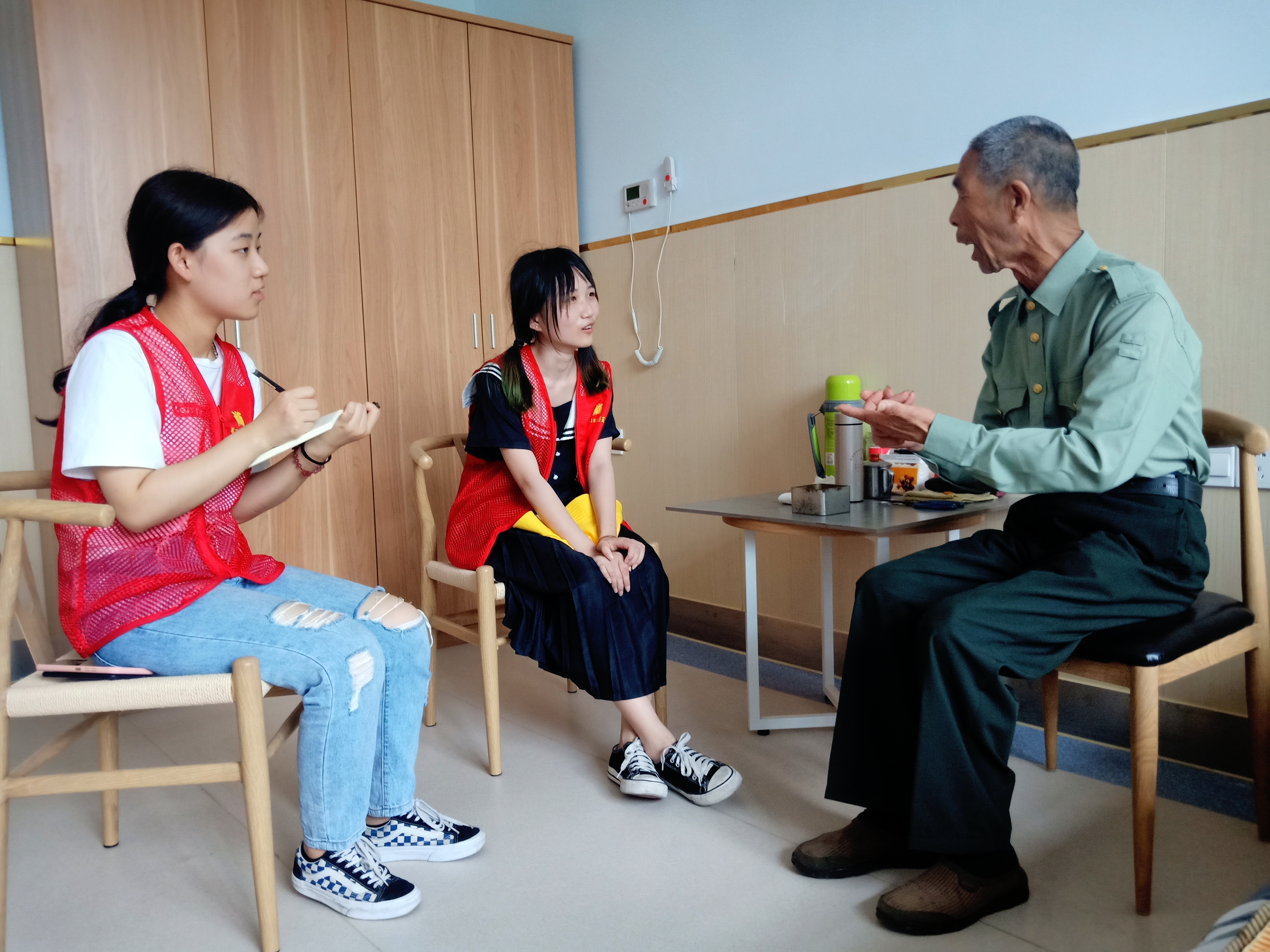 光荣院里年纪最大的兵就是周克美爷爷了。谈起当兵日常,他对我们说要翻过三座山,我本以为是三座真正的山,其实是党要翻越的三道险阻(三座大山即指新民主主义革命时期三座大山,即帝国主义、封建主义和官僚资本主义)。“我不怕死,我怕的是见到幸存的战友眼泪止不住地流。“周老在光荣院十多年了,他没有什么亲人,唯一的女儿去世了。加上常年的耳背,唯一联系的亲人只有他的外孙,他说外孙会在每年暑假回来看他,说到这儿他嘴角抑制不住的笑。在问到他对我们大学生有什么期许,他在笔记本上写下这段话:迫切希望我们大学生做到让党和人民政府放心的接班人。