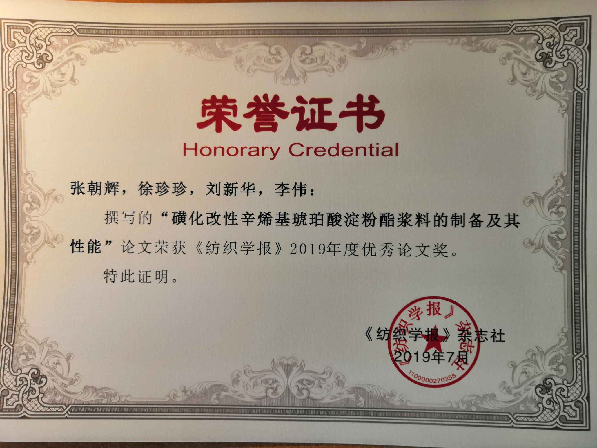 为提高期刊学术质量,鼓励更多优质论文作者投稿,促进纺织科技创新和学术交流,《纺织学报》2019年遴选2017-2018发表在《纺织学报》的所有论文,综合考虑文献计量指标、专家评审情况和微信平台投票,评选出15篇优秀论文。我校纺服学院教师张朝辉等人撰写的“磺化改性辛烯基琥珀酸淀粉酯浆料的制备及其性能”论文获2019年《纺织学报》优秀论文奖。