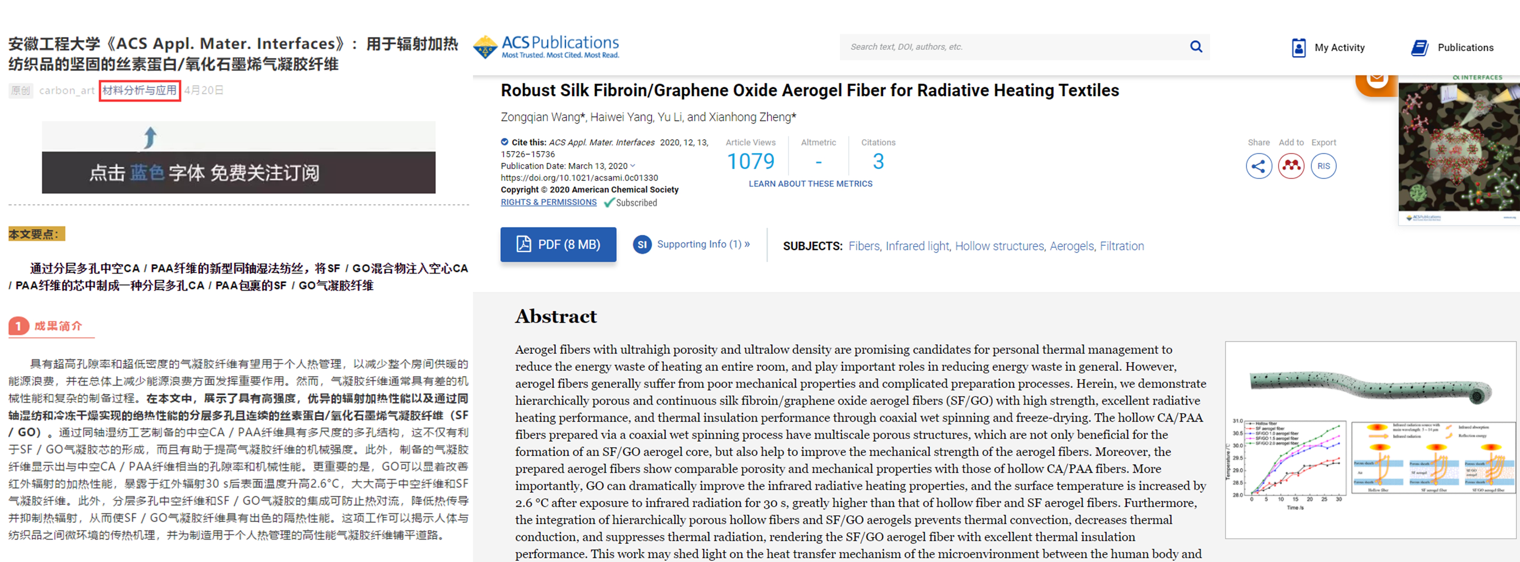 相关成果以“Robust Silk Fibroin/Graphene Oxide Aerogel Fiber for Radiative Heating Textiles”为题在ACS Applied Materials & Interfaces(IF:8.758,中科院一区TOP期刊)上发表后,材料领域微信公众号—“材料分析与应用”也以“RayBetApp官网下载 《ACS Appl. Mater. Interfaces》:用于辐射加热纺织品的坚固的丝素蛋白/氧化石墨烯气凝胶纤维”为题进行了重点报道,并在智能可穿戴领域引起广泛关注,目前该论文浏览量已经超过1000余次。该论文第一、二作者分别为王宗乾和2017级研究生杨海伟,通讯作者为郑贤宏博士。此外,该研究成果也得到了安徽省重点研究和发展计划项目(1804a09020077)、芜湖市科技计划项目(2018pt04)、安徽省重大科技专项(201903a05020028)和RayBetApp官网下载 引进人才科研启动基金(2020YQQ002)等项目的支持。