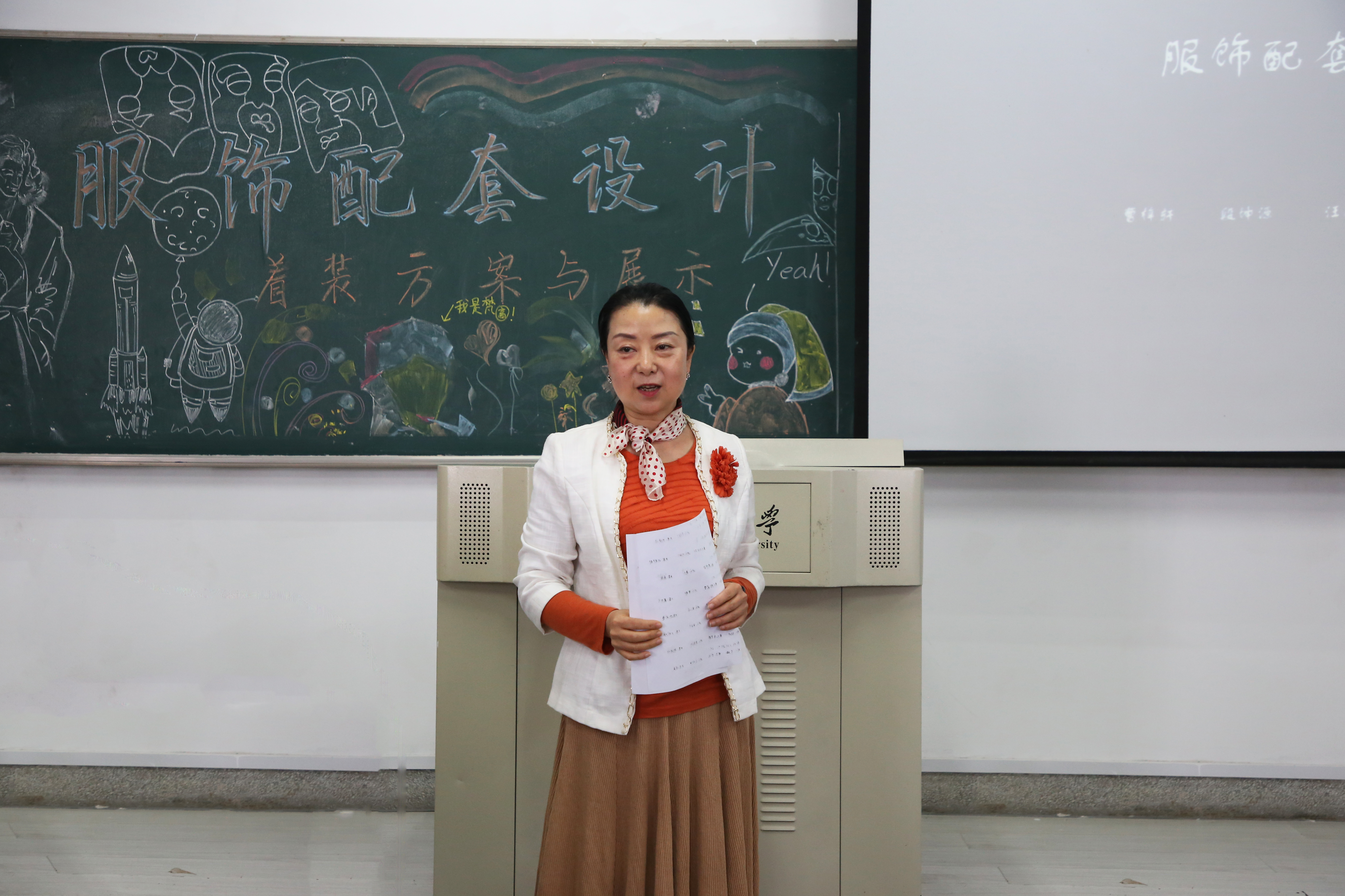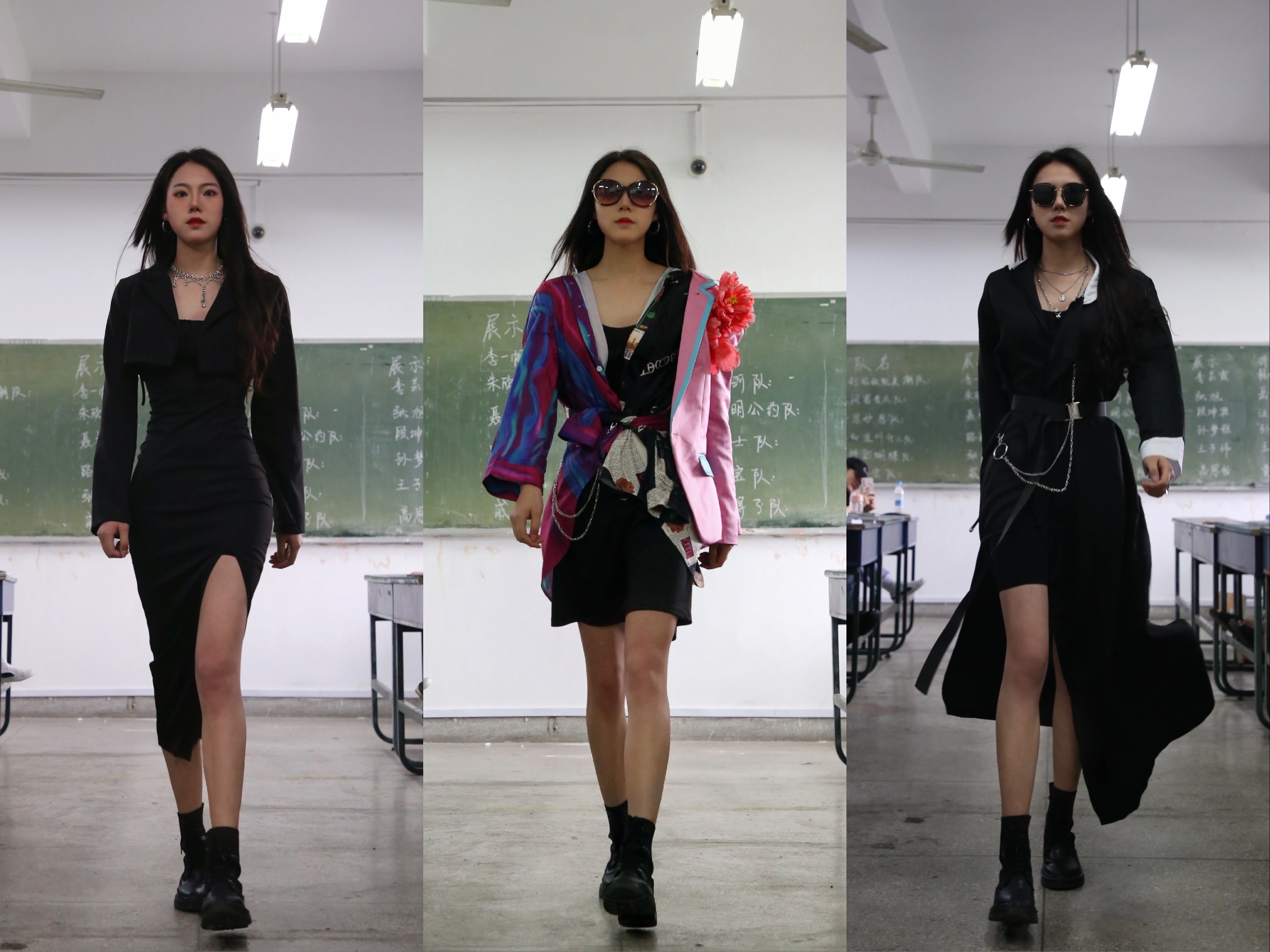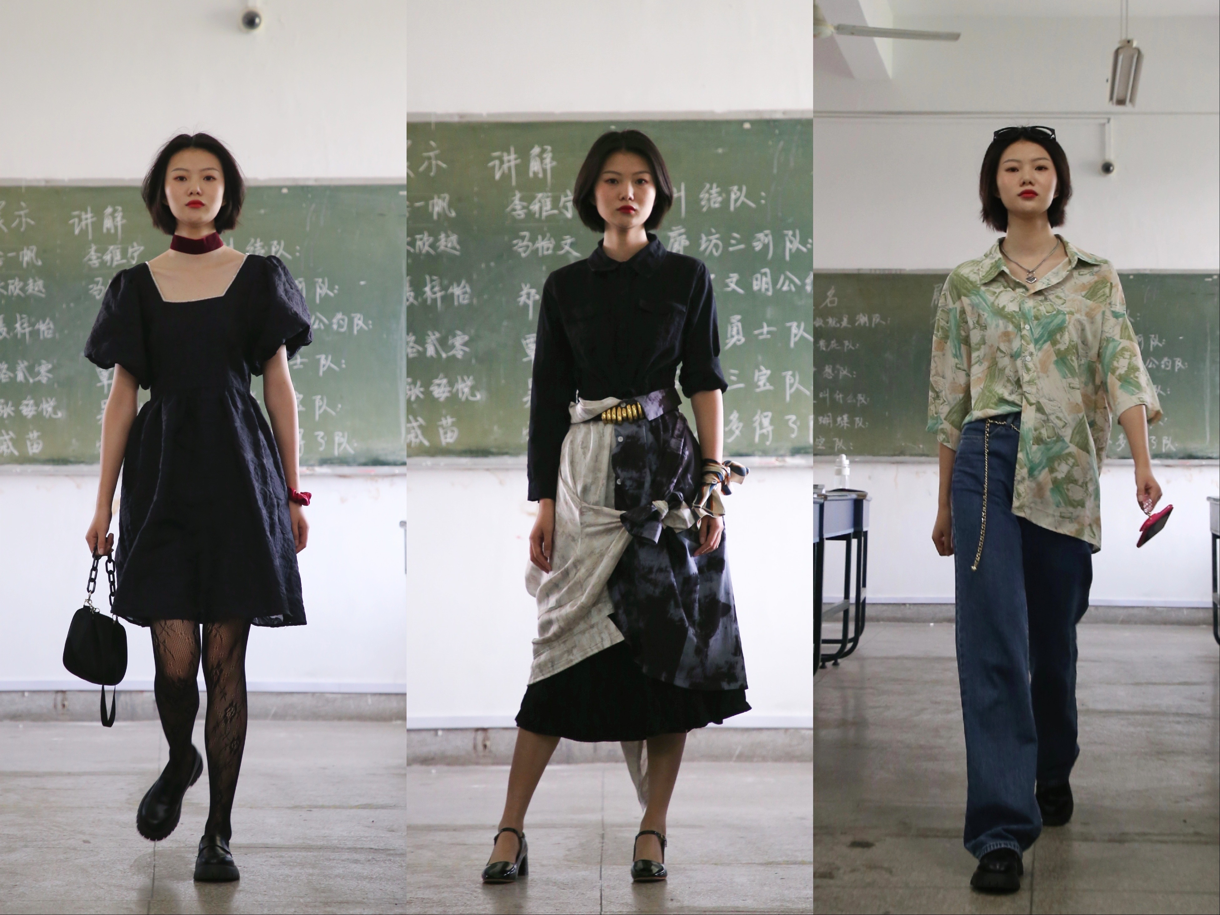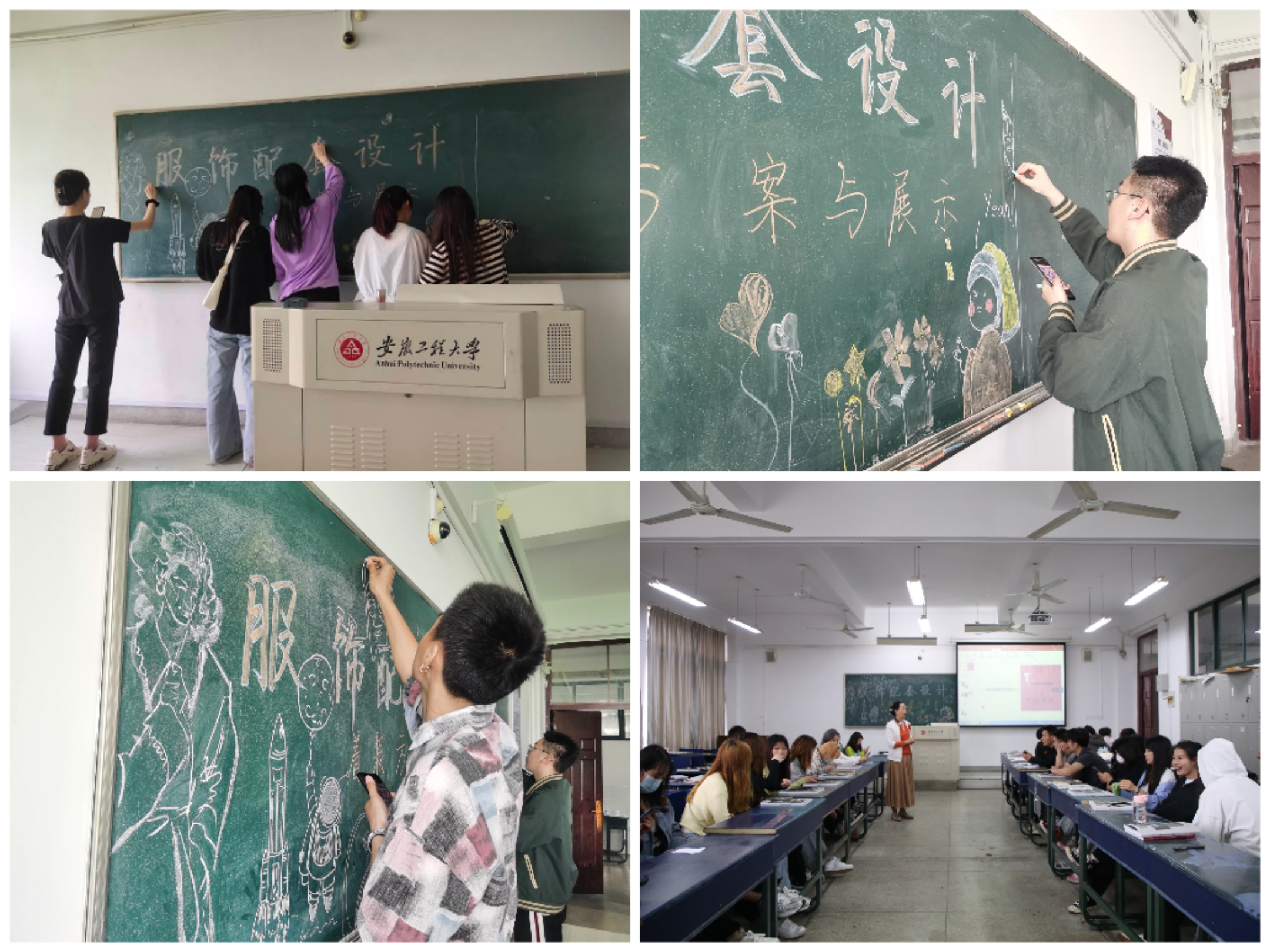 同学们将教室布置成T台模样,将黑板绘成漂亮的背景墙,在听取线下讲解和观看线上《服饰配套艺术》课堂之后,自行组成12个小分队 ,围绕服装风格展示,开展研讨,畅谈各自想法。
