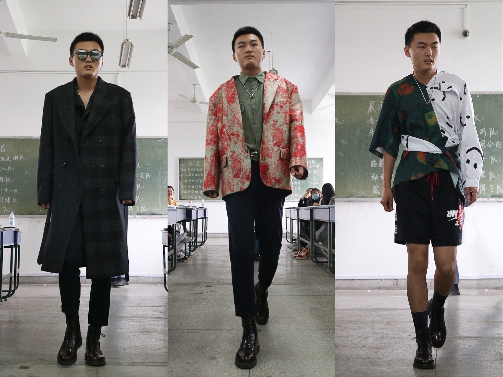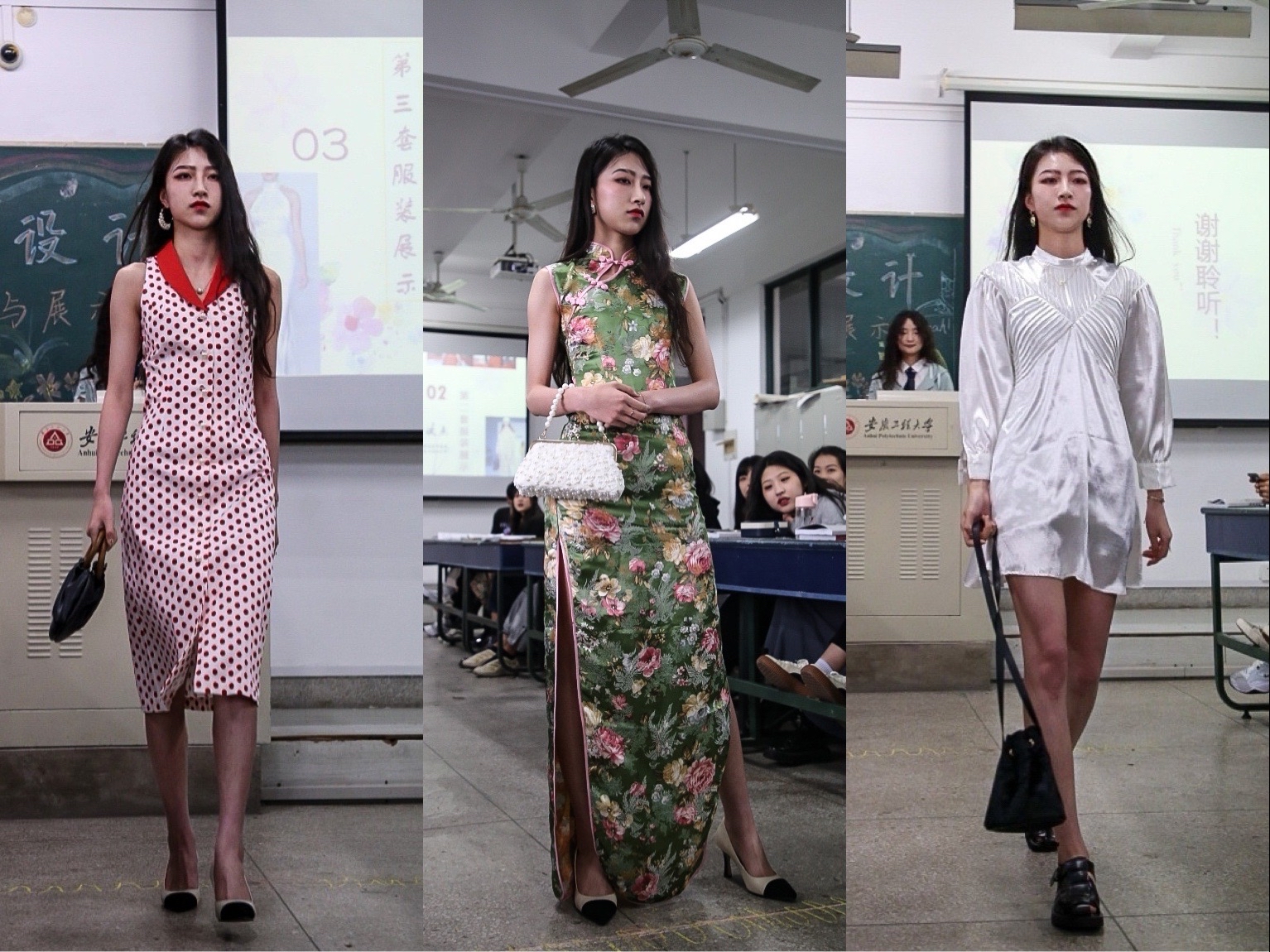 我的课堂我做主。首先主持人登场,结合PPT着装方案,伴随着美妙音乐,同学们先后入场“走台”展示。